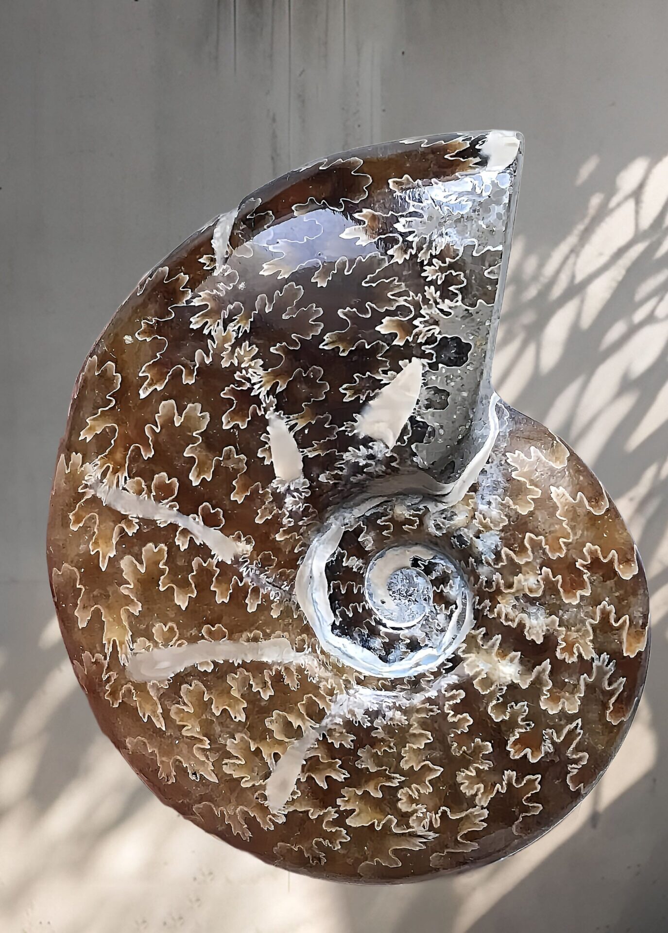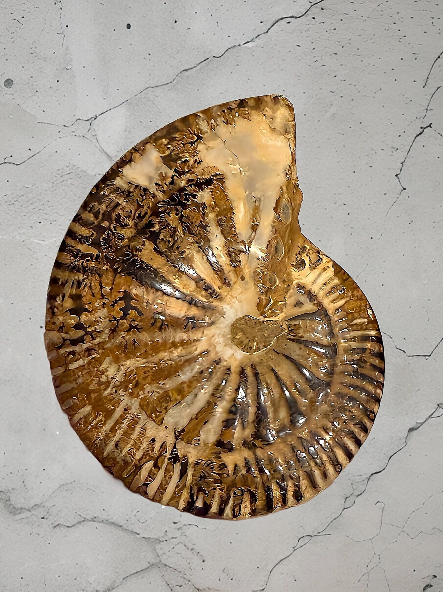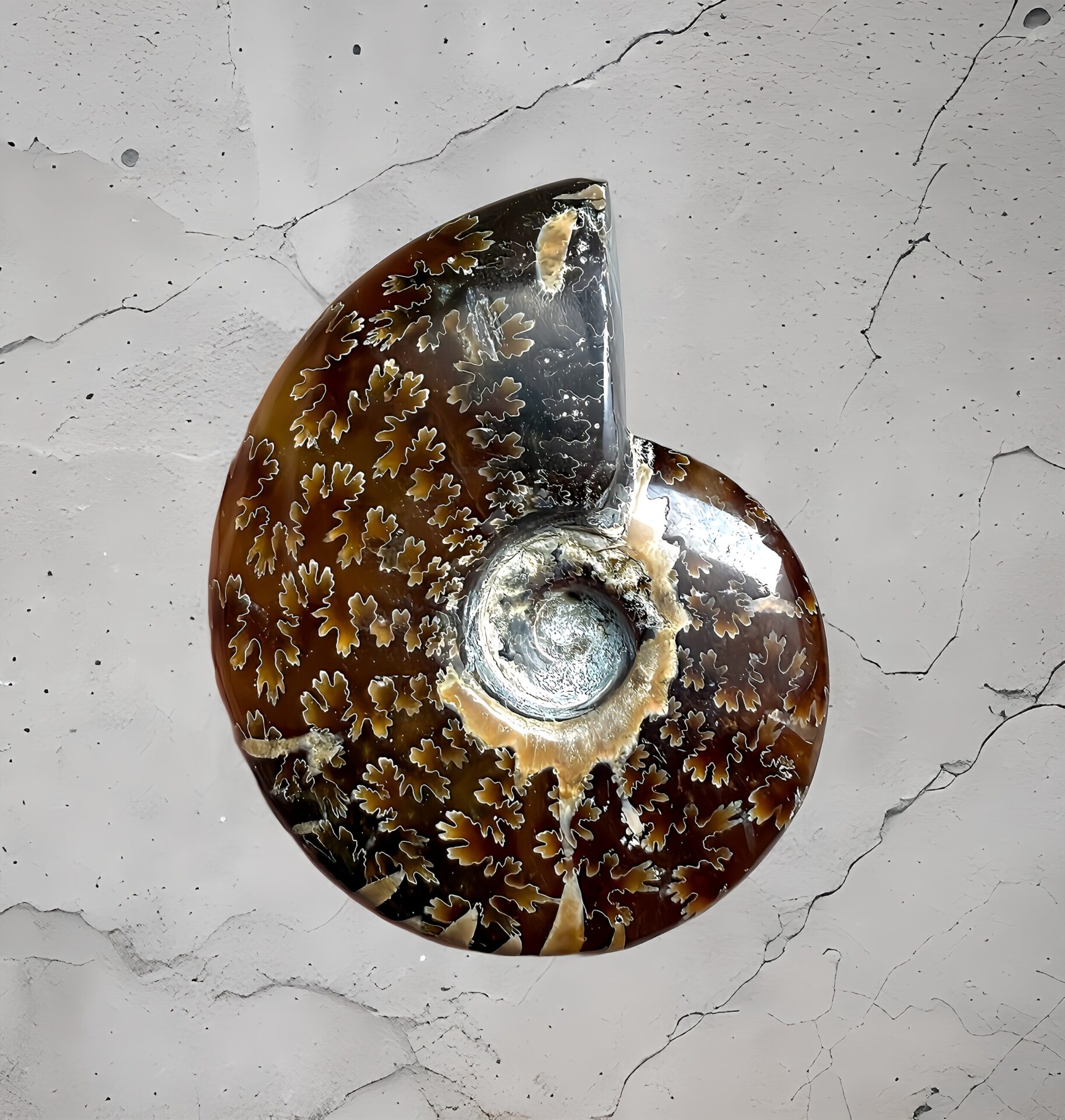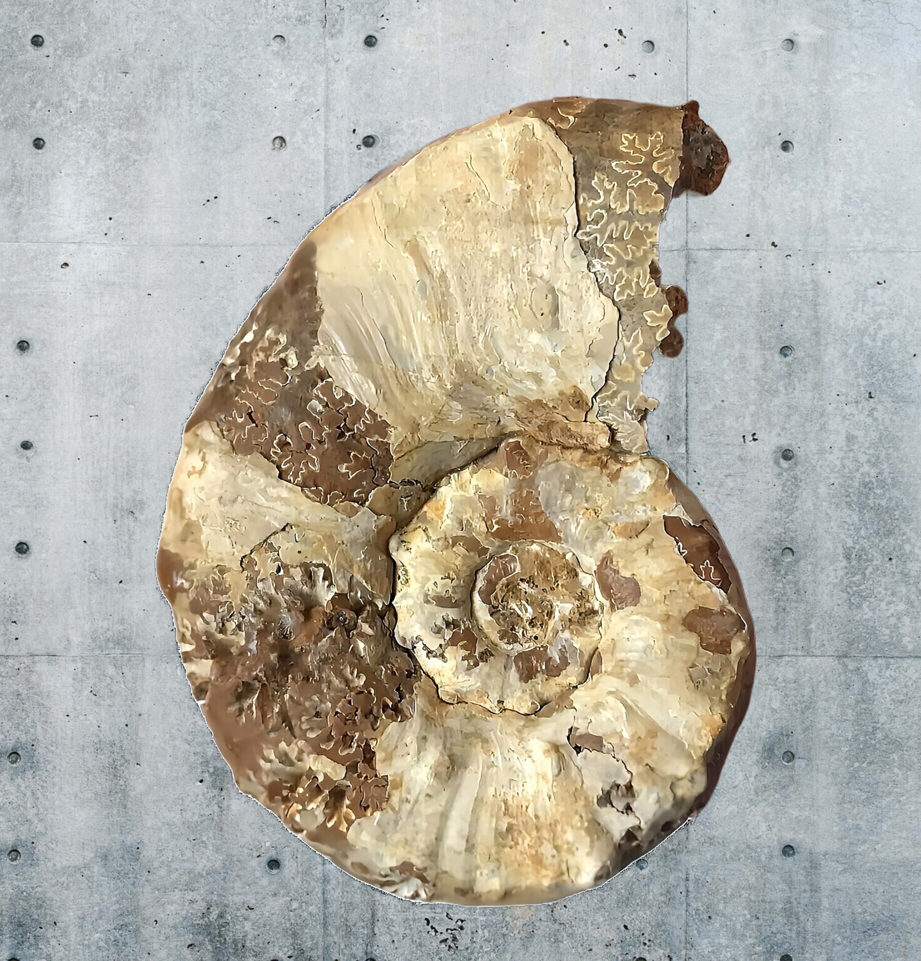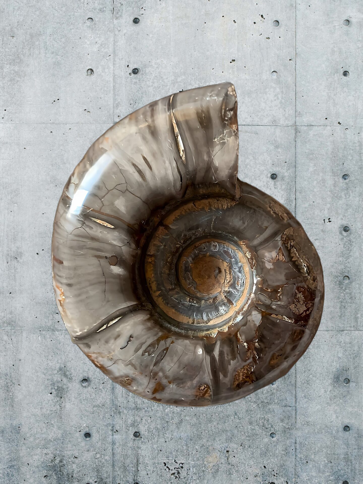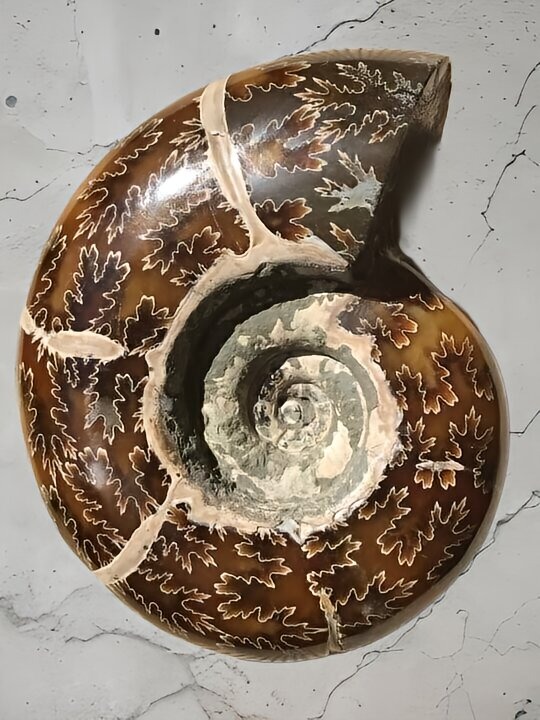 マダガスカル産 褐色アンモナイト-白ペリスフィンクテス 研磨中個体
