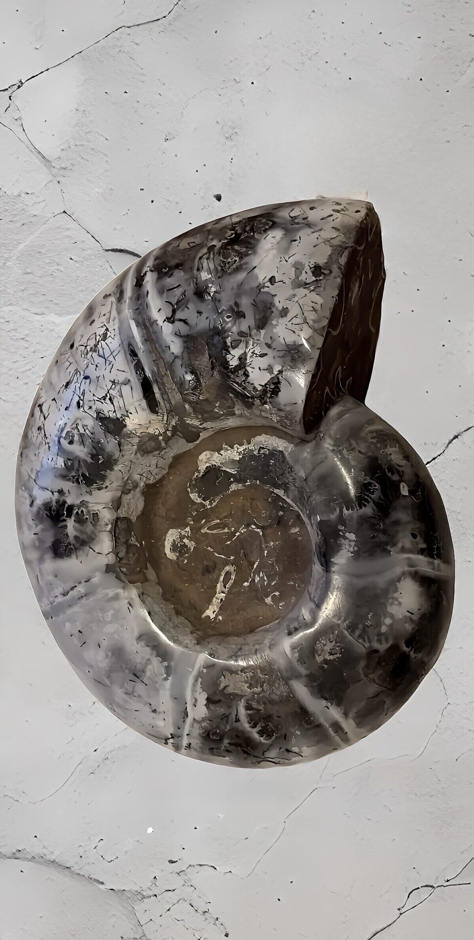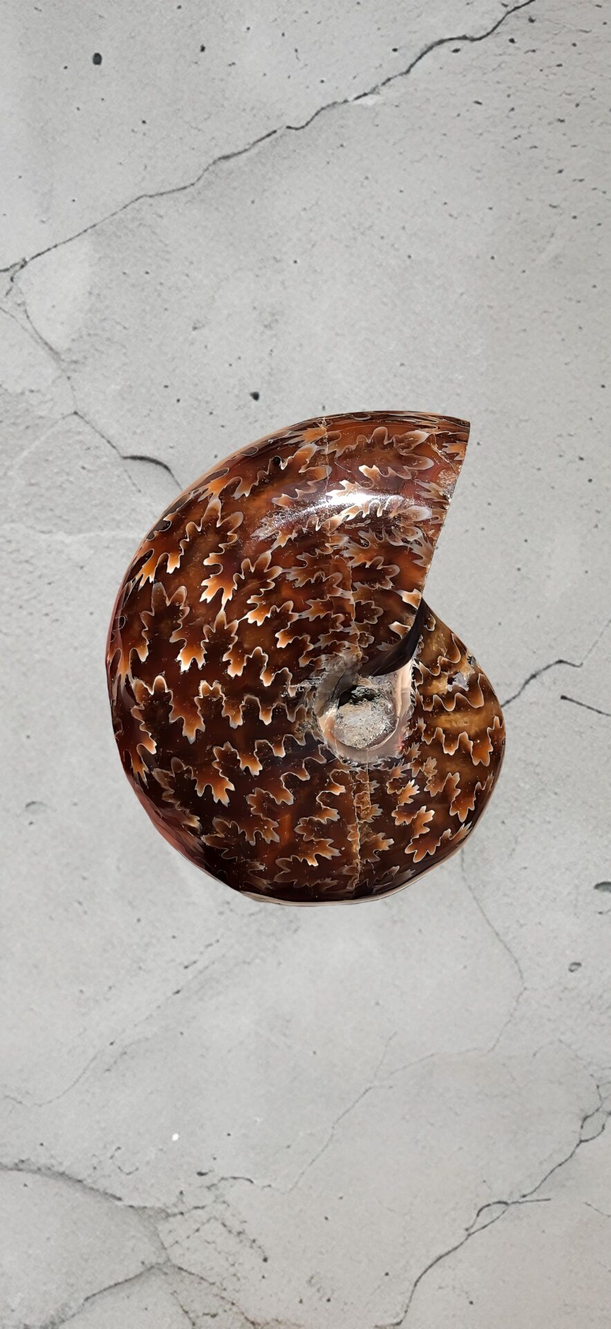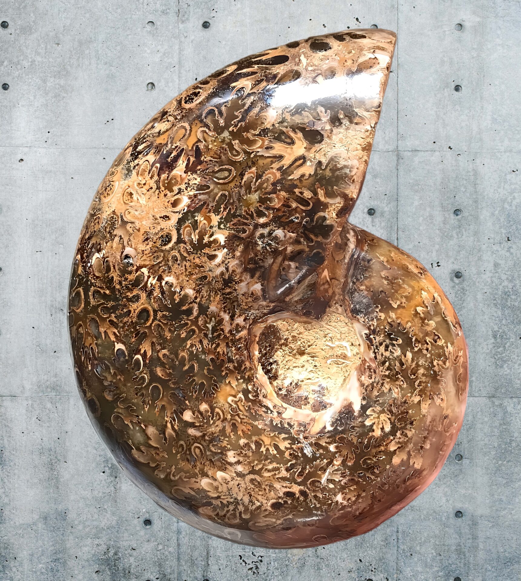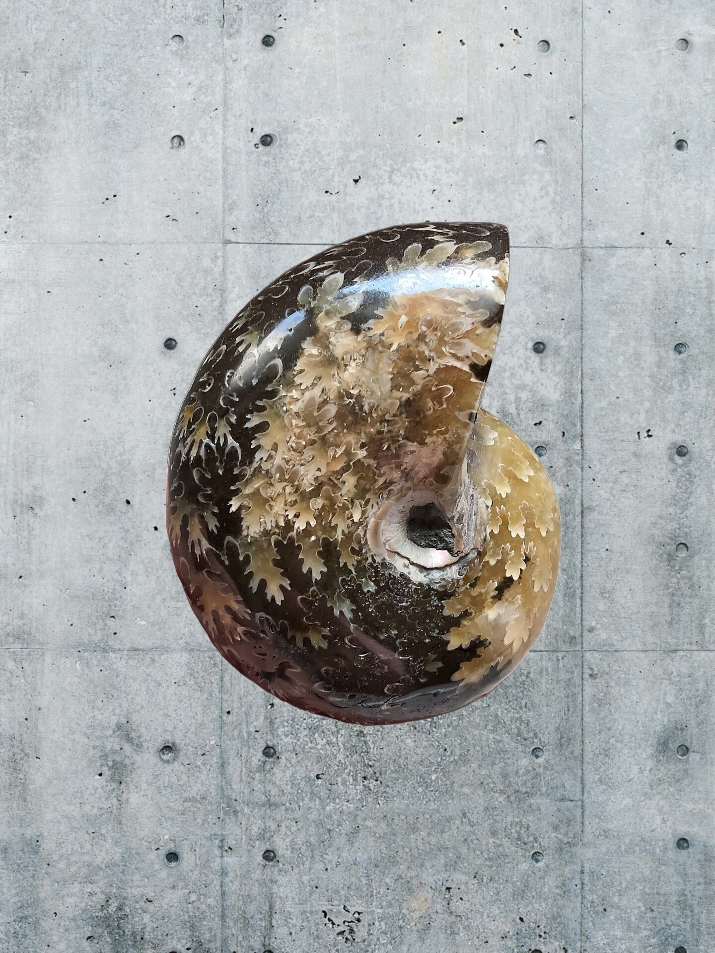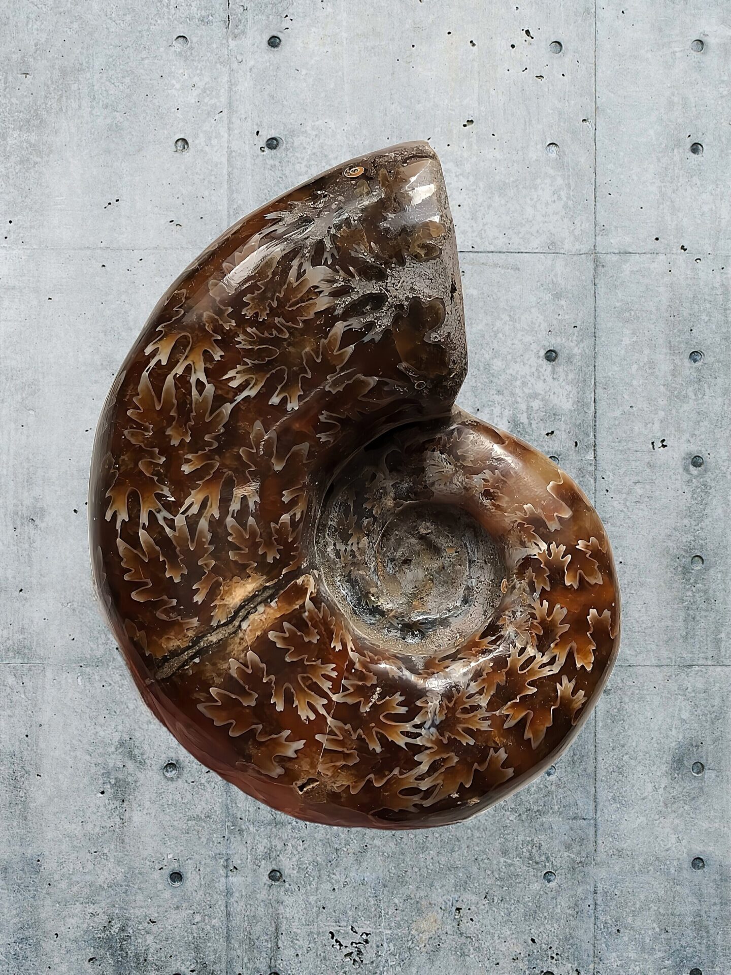 マダガスカル産 褐色アンモナイト-白ペリスフィンクテス 研磨中個体