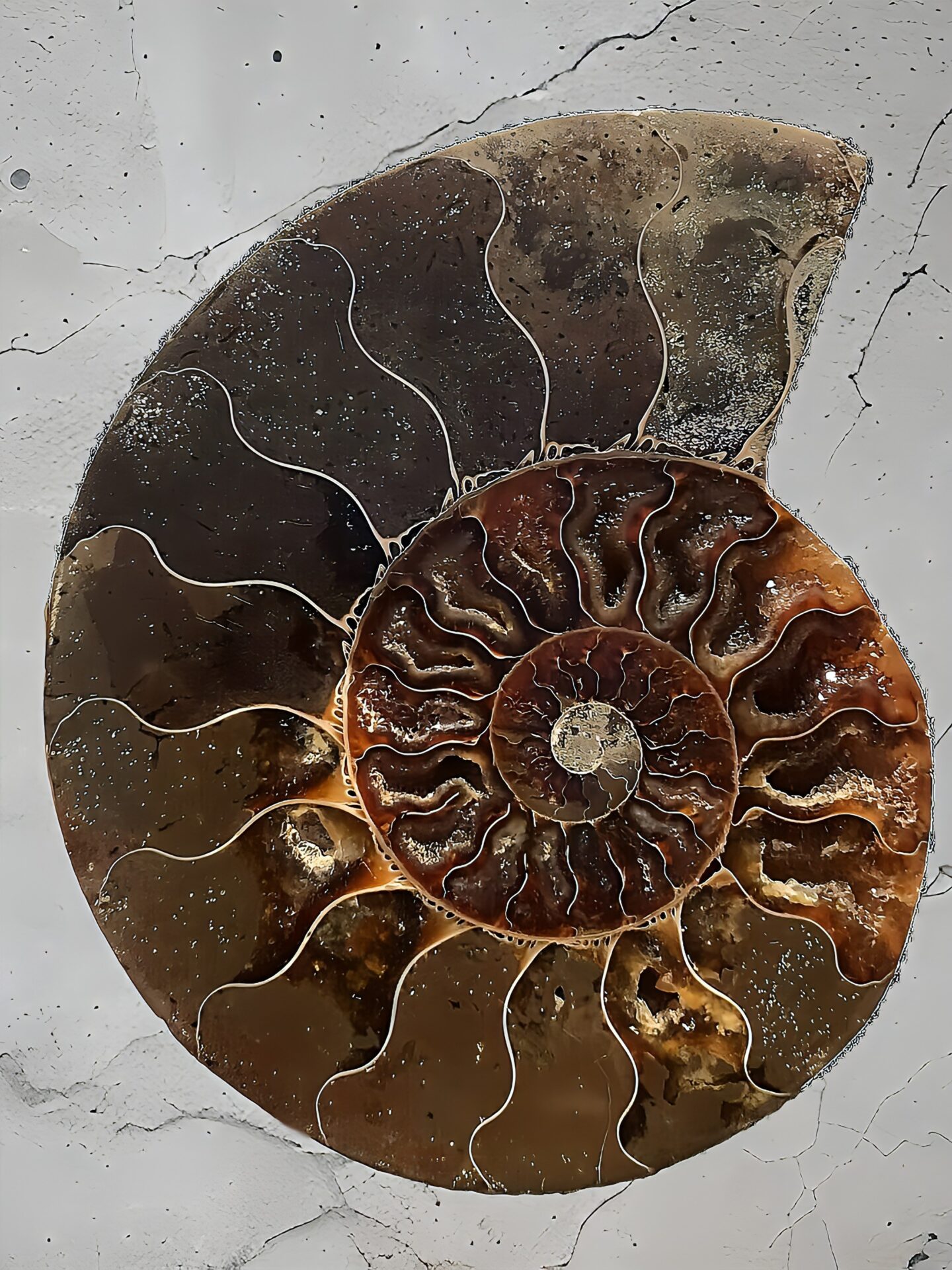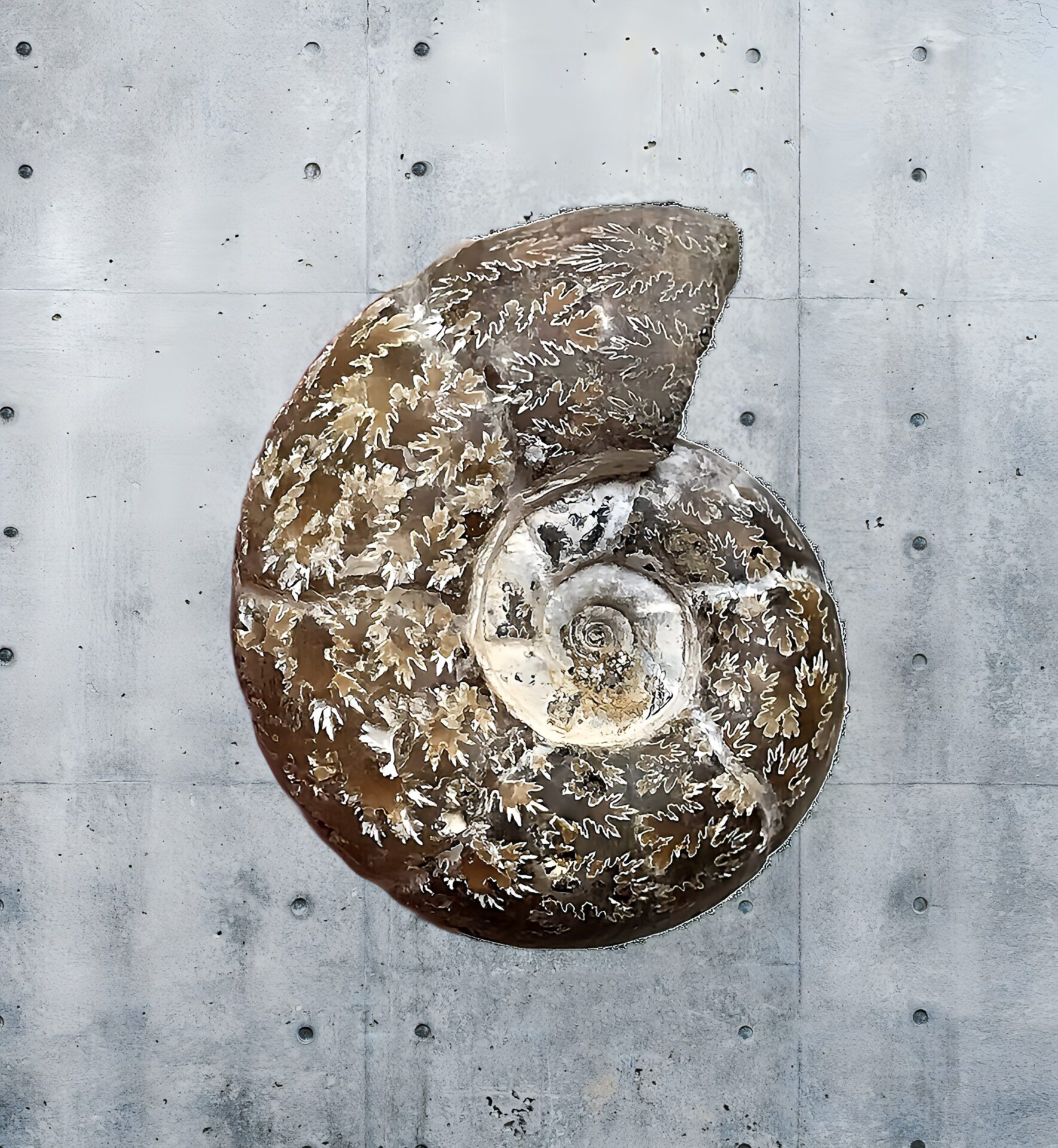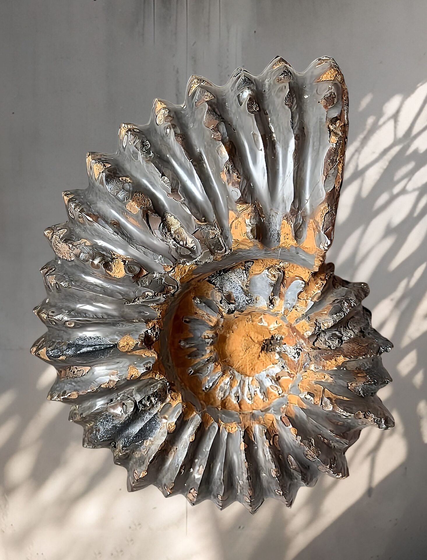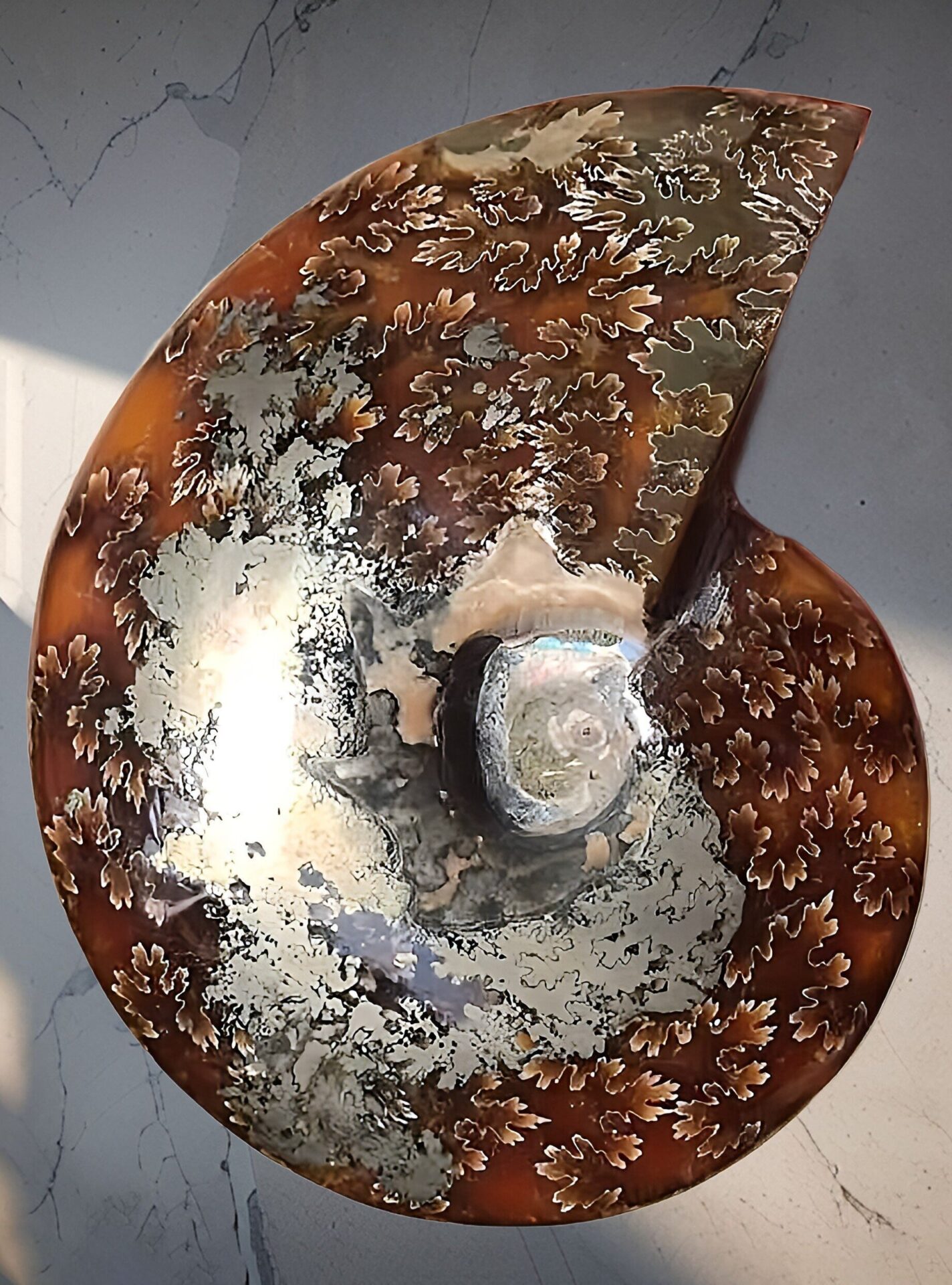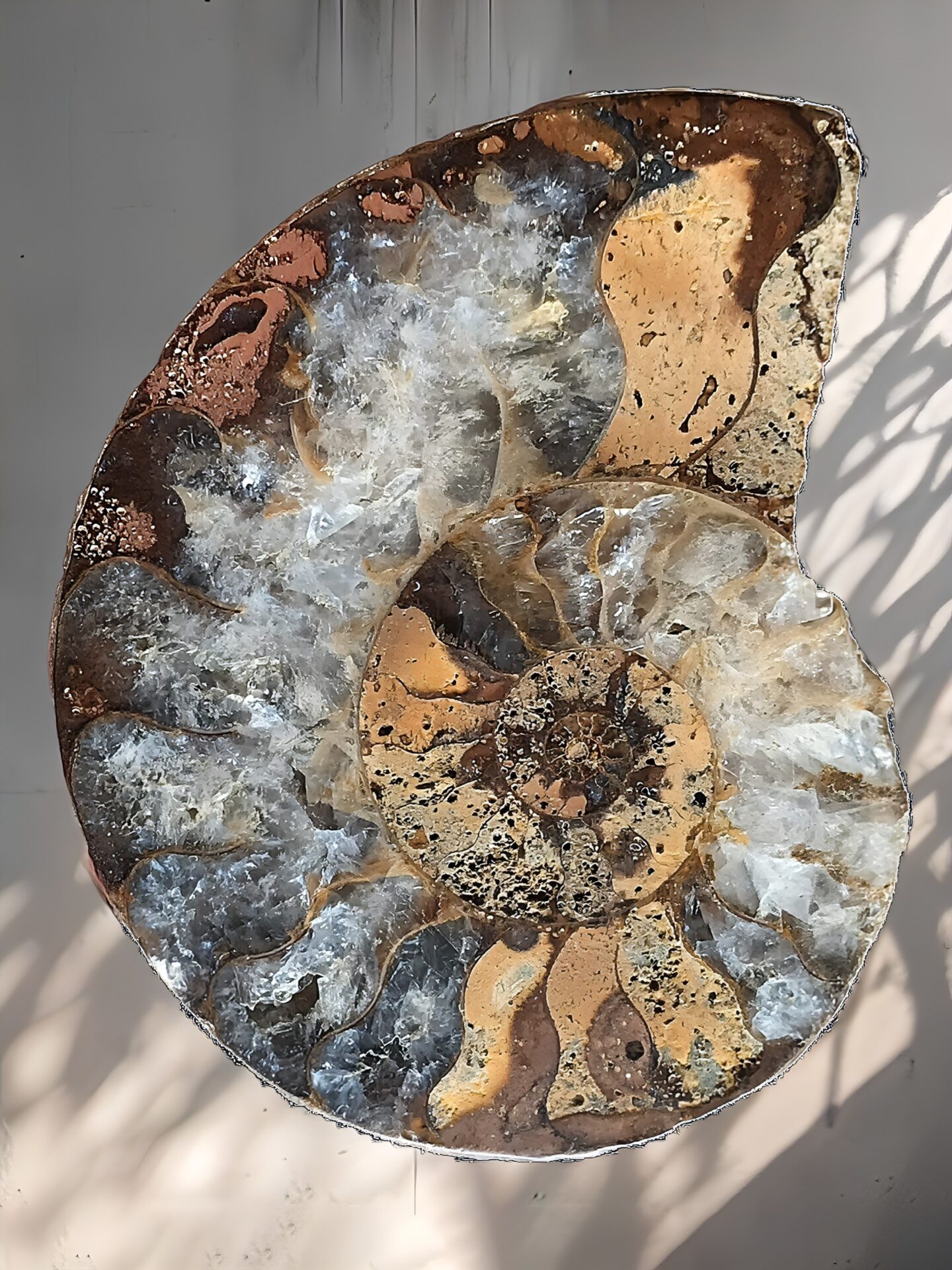 マダガスカル産 褐色アンモナイト-白ペリスフィンクテス 研磨中個体