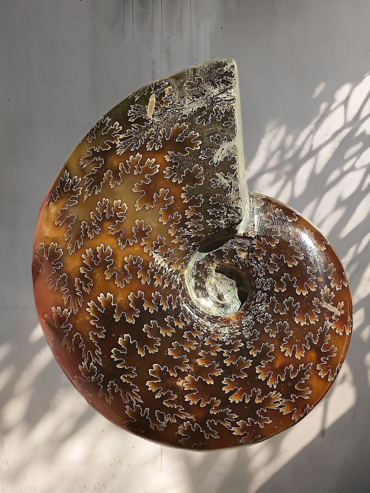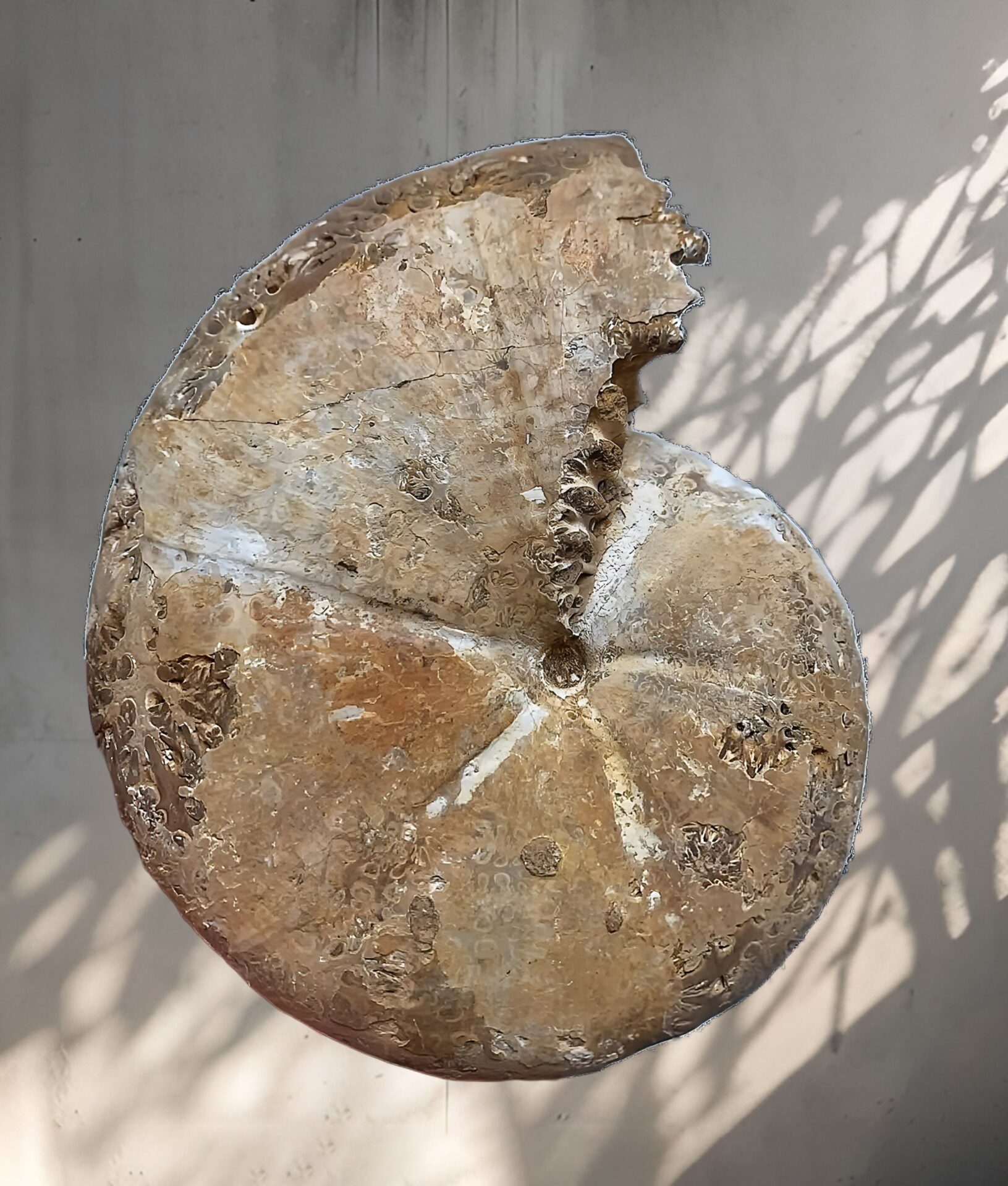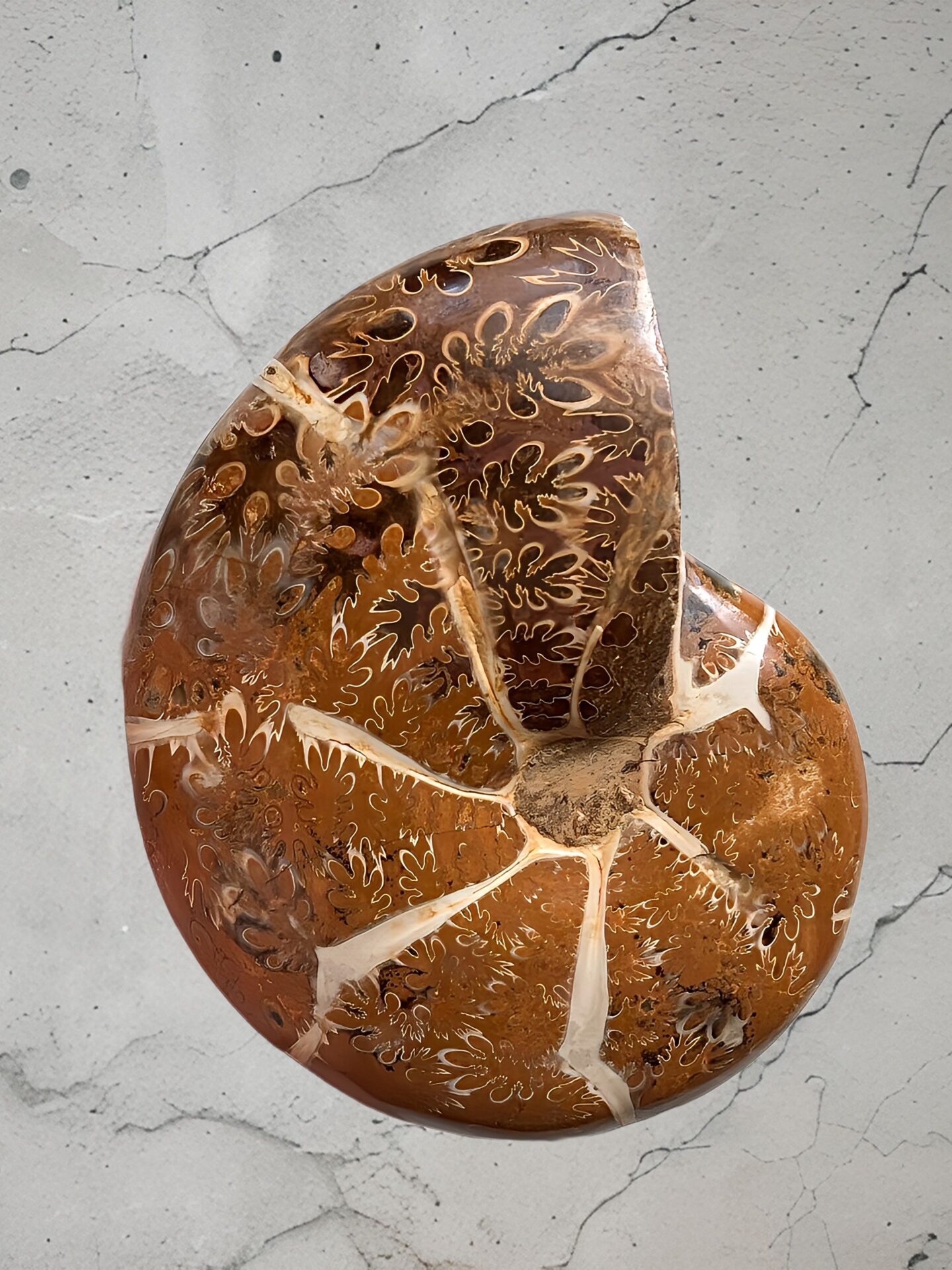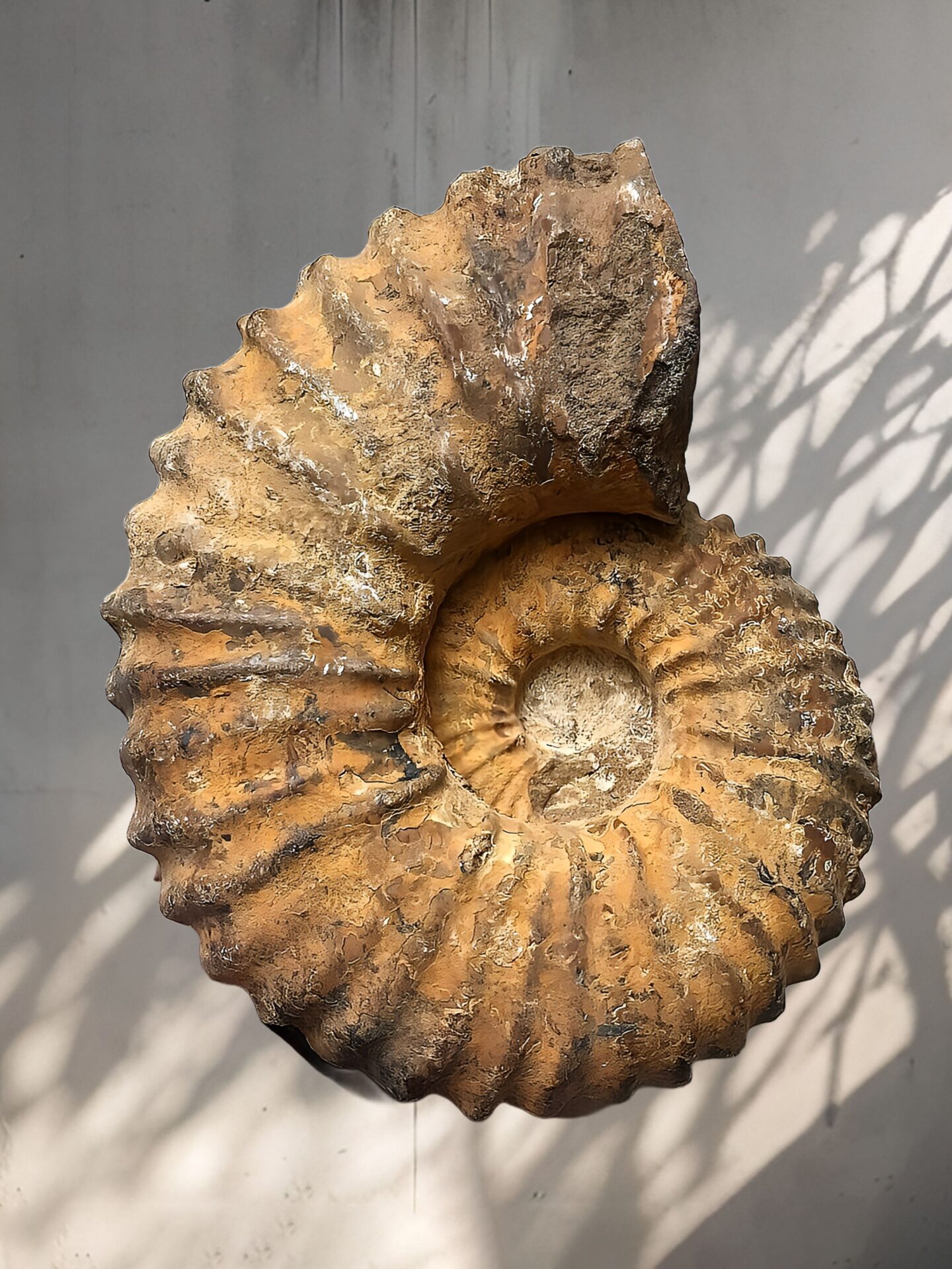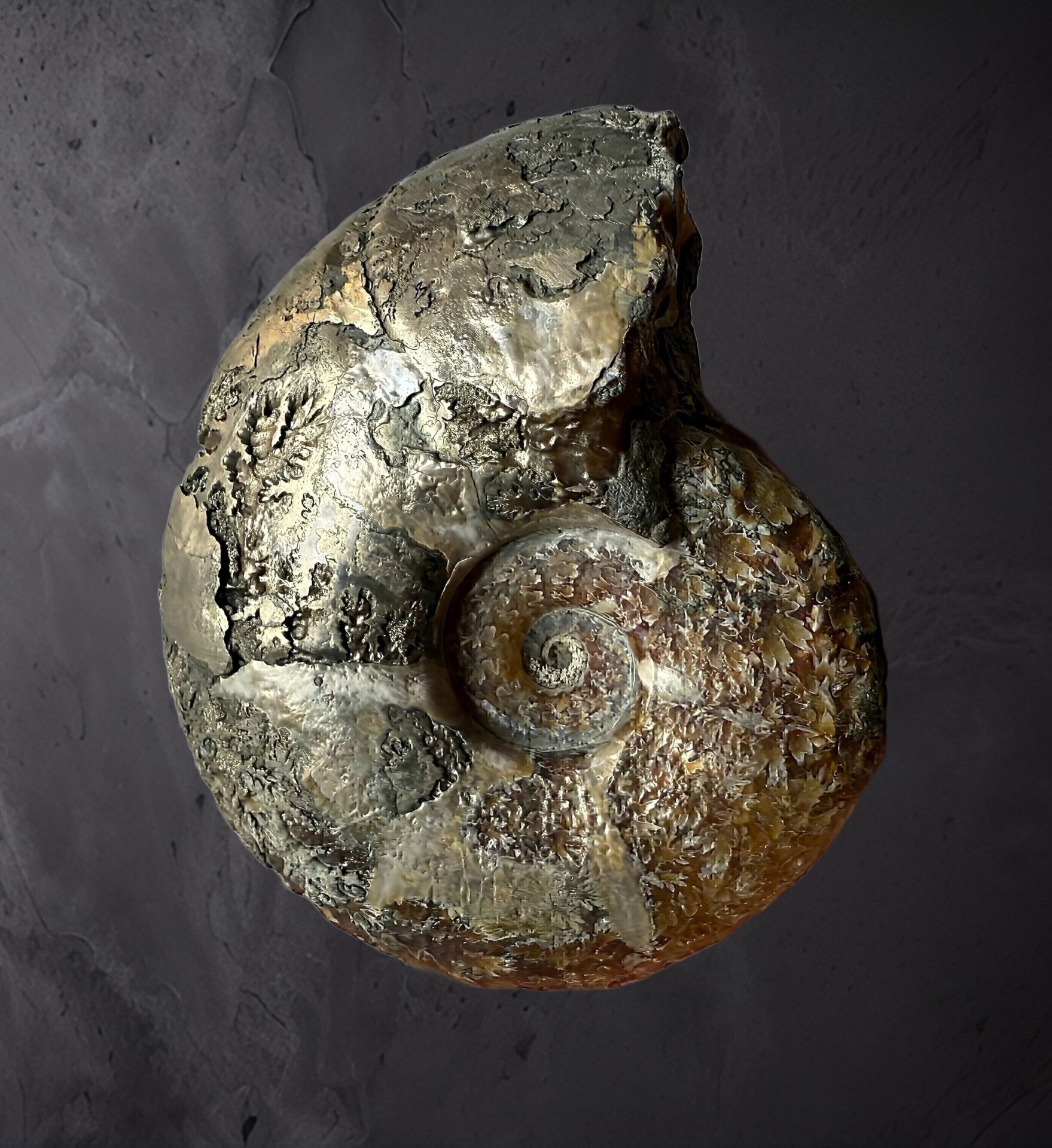 マダガスカル産 褐色アンモナイト-白ペリスフィンクテス 研磨中個体