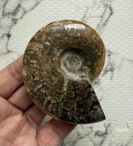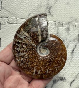 マダガスカル産直輸入 縫合線の浮き出るアンモナイト化石 クレオニセラス 8.2cm 106g 中個体 方解石化 一部遊色