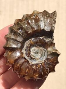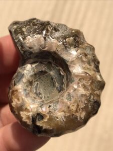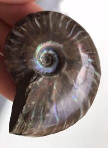 コメント:アンモナイトの静かな輝きに見とれています。ようこそ、現代へというおもいです