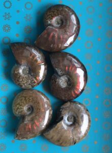 コメント:本日、美しく神秘的な深い赤色のアンモナイトと、素敵なアンモナイトの絵、ハガキが届きました。たいへんに、ありがとうございます。大切にして、楽しませて頂きます。感謝!!