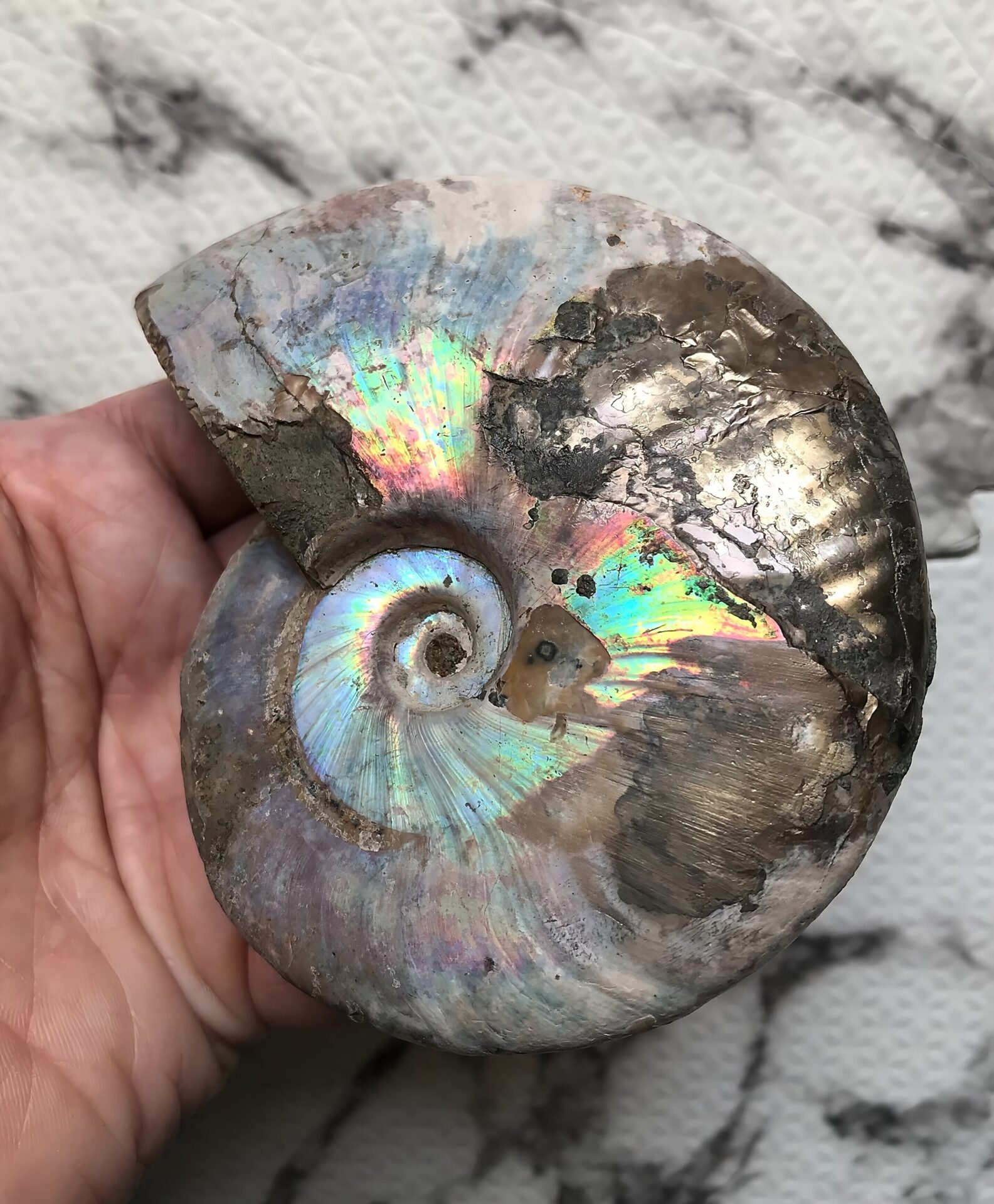 マダガスカル産アンモナイト化石青(クレオニセラス)遊色 黄鉄鉱(パイライト)含有個体