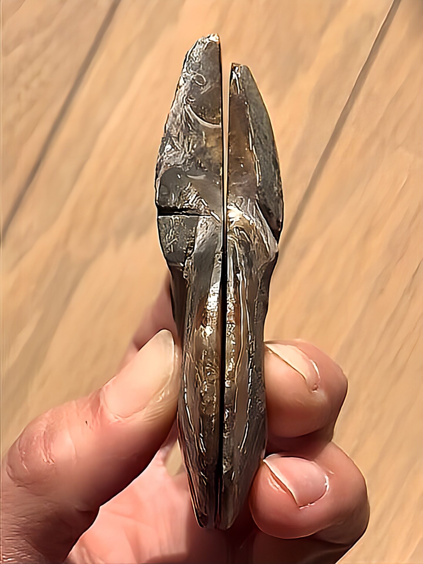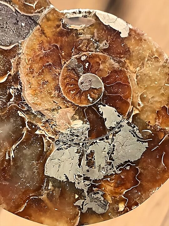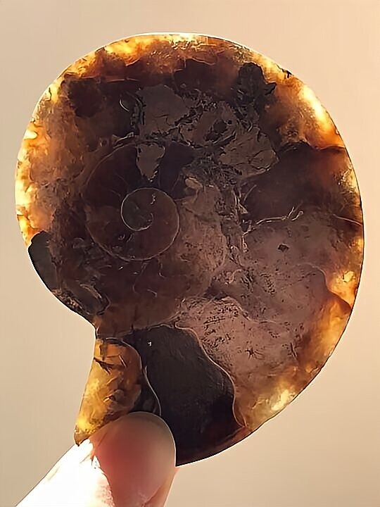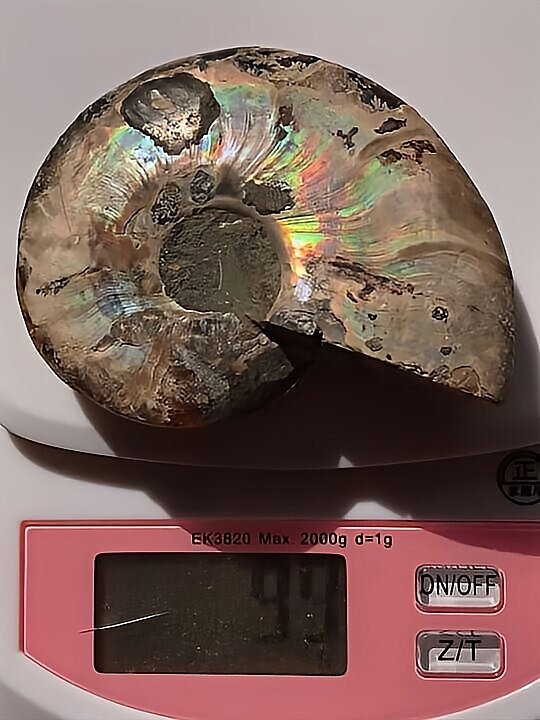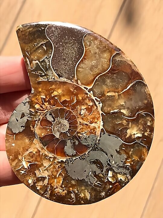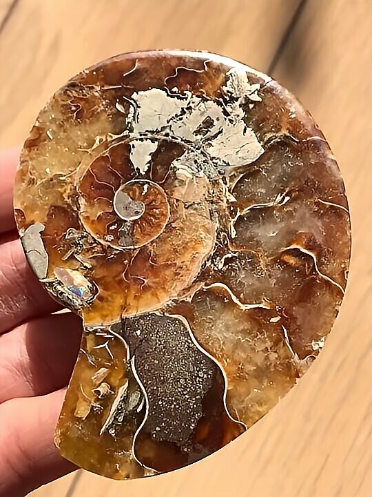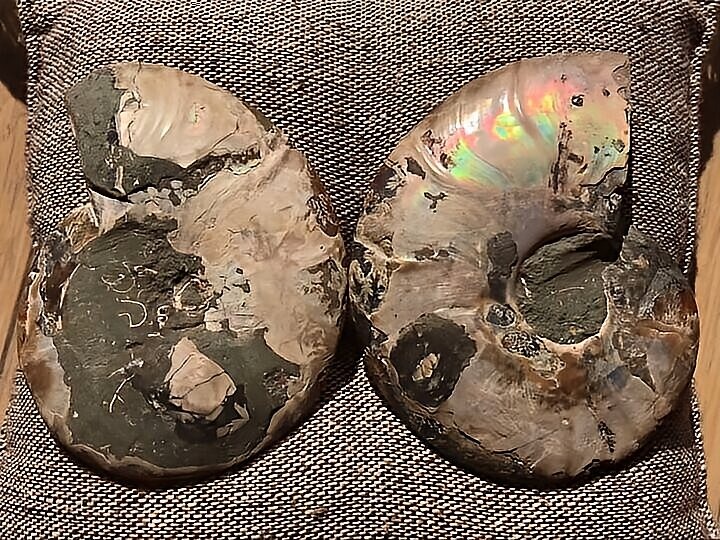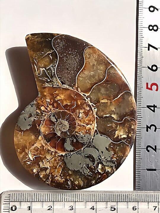 マダガスカル マハジャンガ産 アンモナイト化石青 クリオニセラス スライスアンモナイト 裁断個体 黄鉄鉱含有 重さ 約99g 寸法 約7.2cm、約7.5cm(真ん中からズレて裁断されているため、2つの大きさ・厚みに差異があります) ⭐︎裁断面は方解石化されていて、光にかざすと周りが透けて見えます。 わずかですが片面一部、また表面からは虹色遊色が見られます。 また、黄鉄鉱が含有され、その部分は金色に輝き触った感じや匂いが鉄です。 コレクションにいかがでしょうか。状態は写真にてご確認ください。 ⭐︎日中の太陽光にて撮影をしておりますが、画像には映らない多少のキズ、 欠け等がある可能性、またカメラの性能や光の具合によって現物との色の違いがある場合がございます。