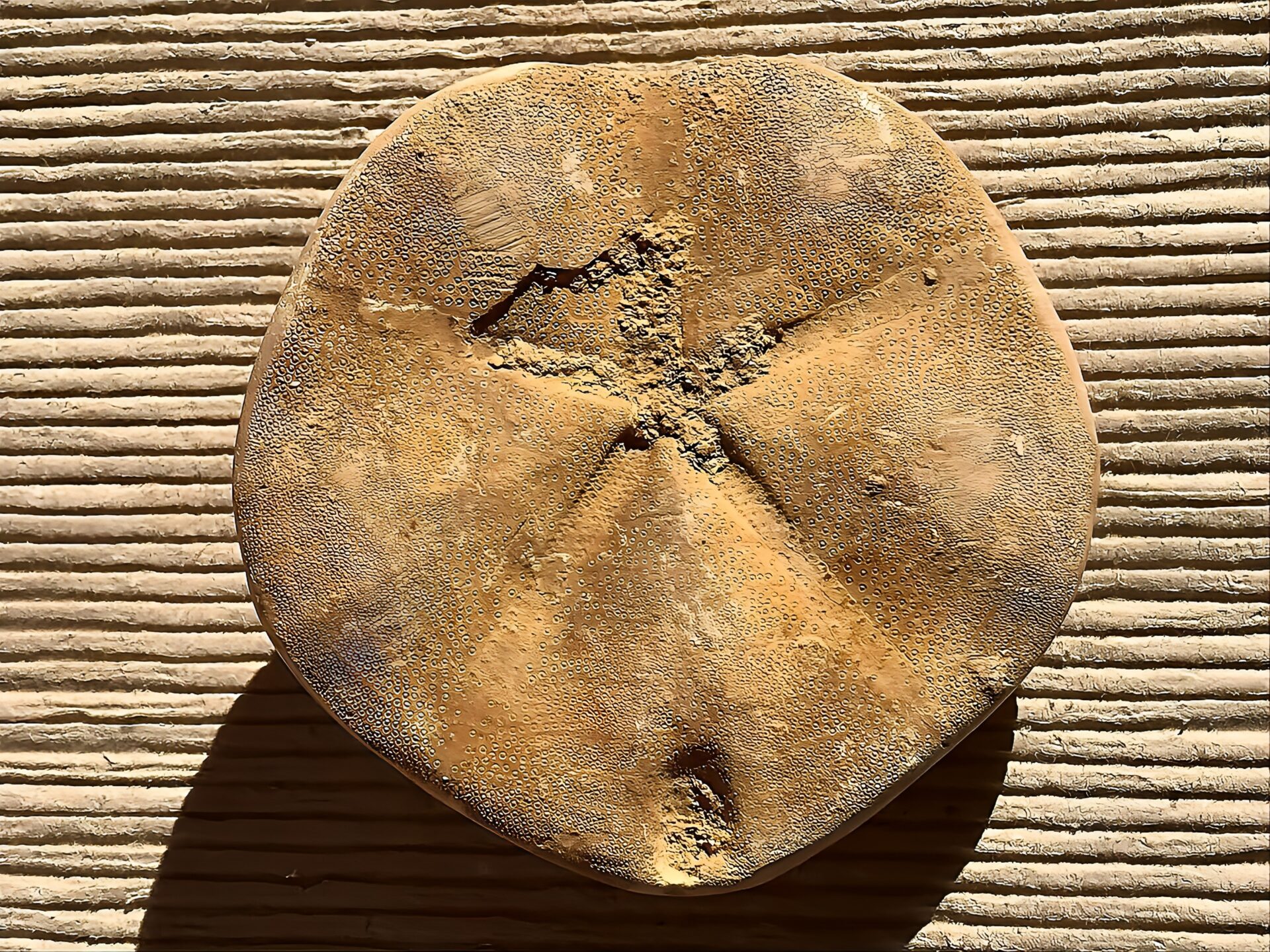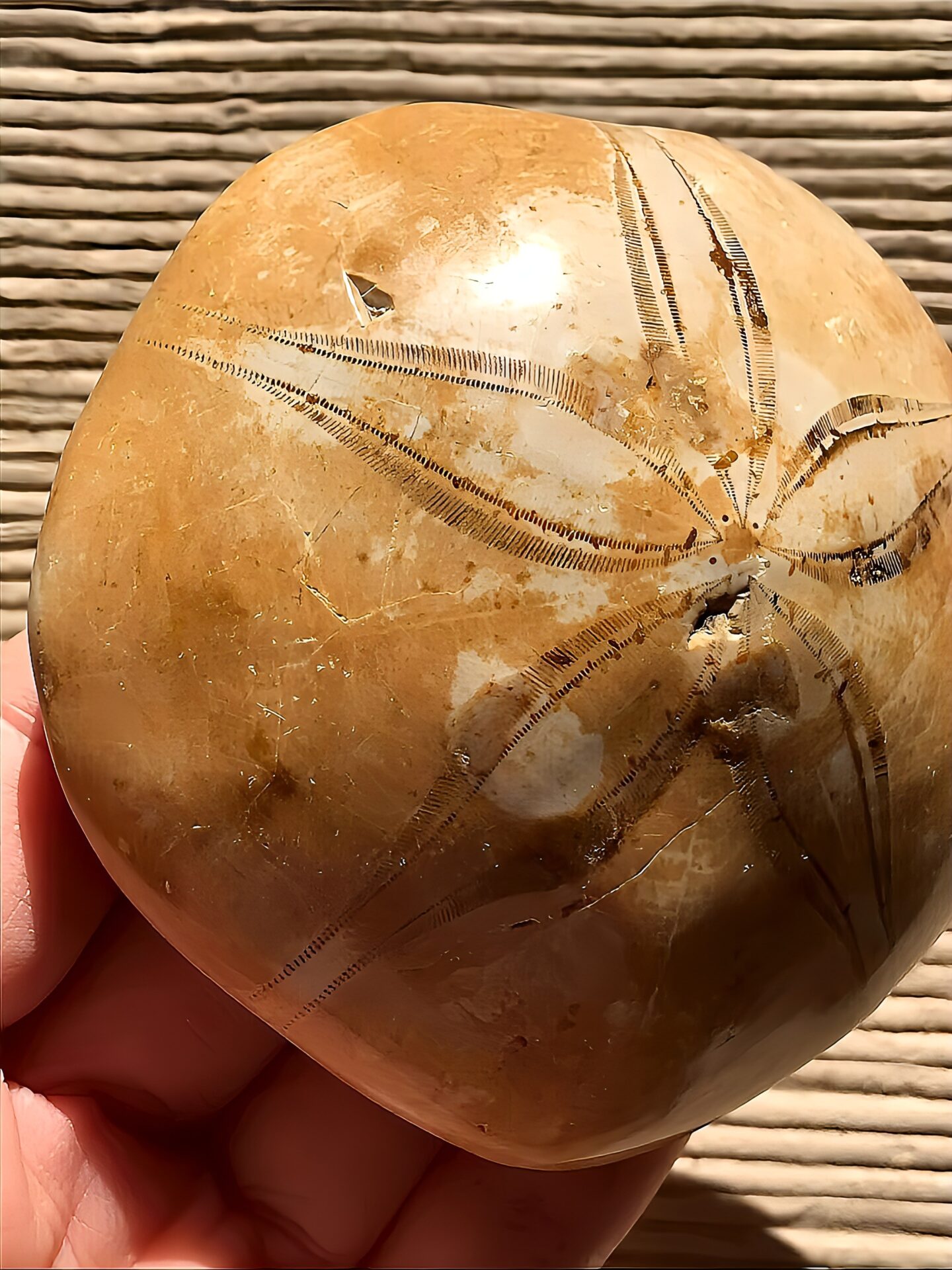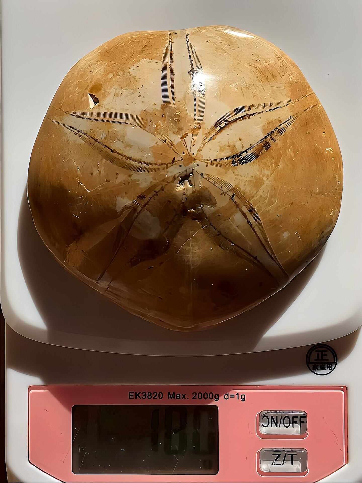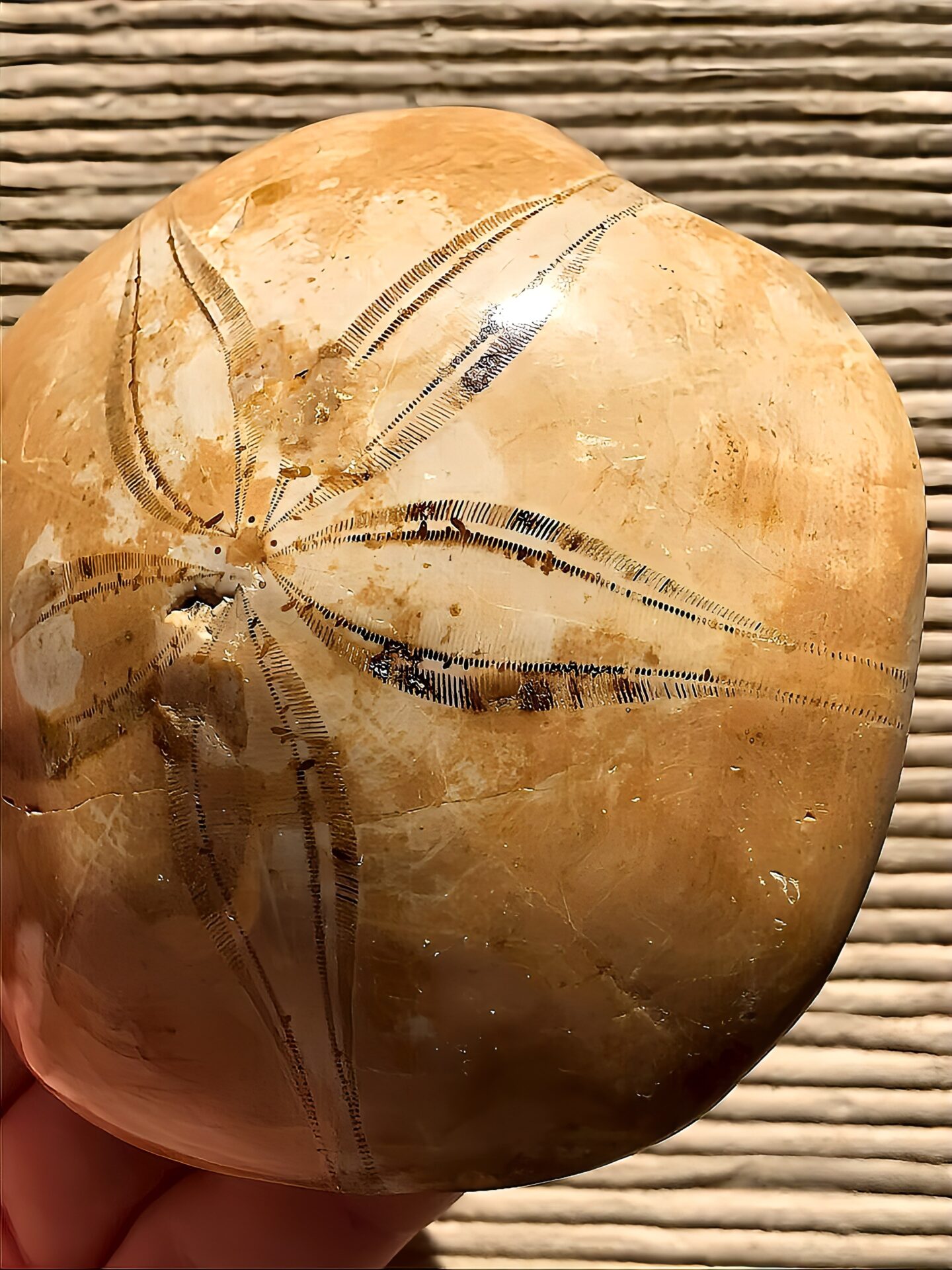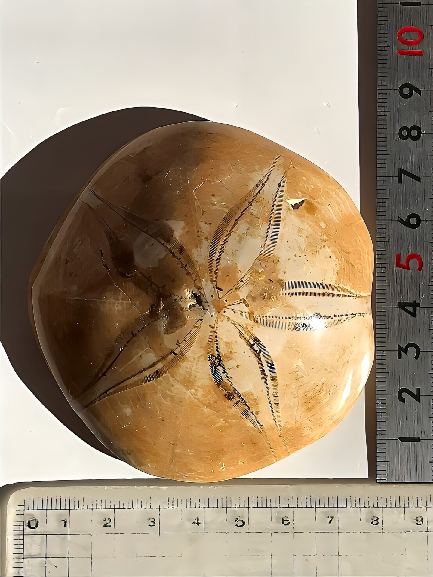 マダガスカル チュレア産 ウニの化石 タコノマクラ 中生代ジュラ紀 重さ 約52g 寸法 約7.7cm(最長部) ⭐︎中心部が膨らんでいて、花びらのような五芒星の模様が特徴なウニの化石です。 コレクションやプレゼントにいかがでしょうか。状態は写真にてご確認ください。 ※表面は研磨によりツルツルですが、裏面は未研磨でザラザラとしています。 ⭐︎日中の太陽光にて撮影をしておりますが、画像には映らない多少のキズ、欠け等がある可能性、 またカメラの性能や光の具合によって現物との色の違いがある場合がございます。