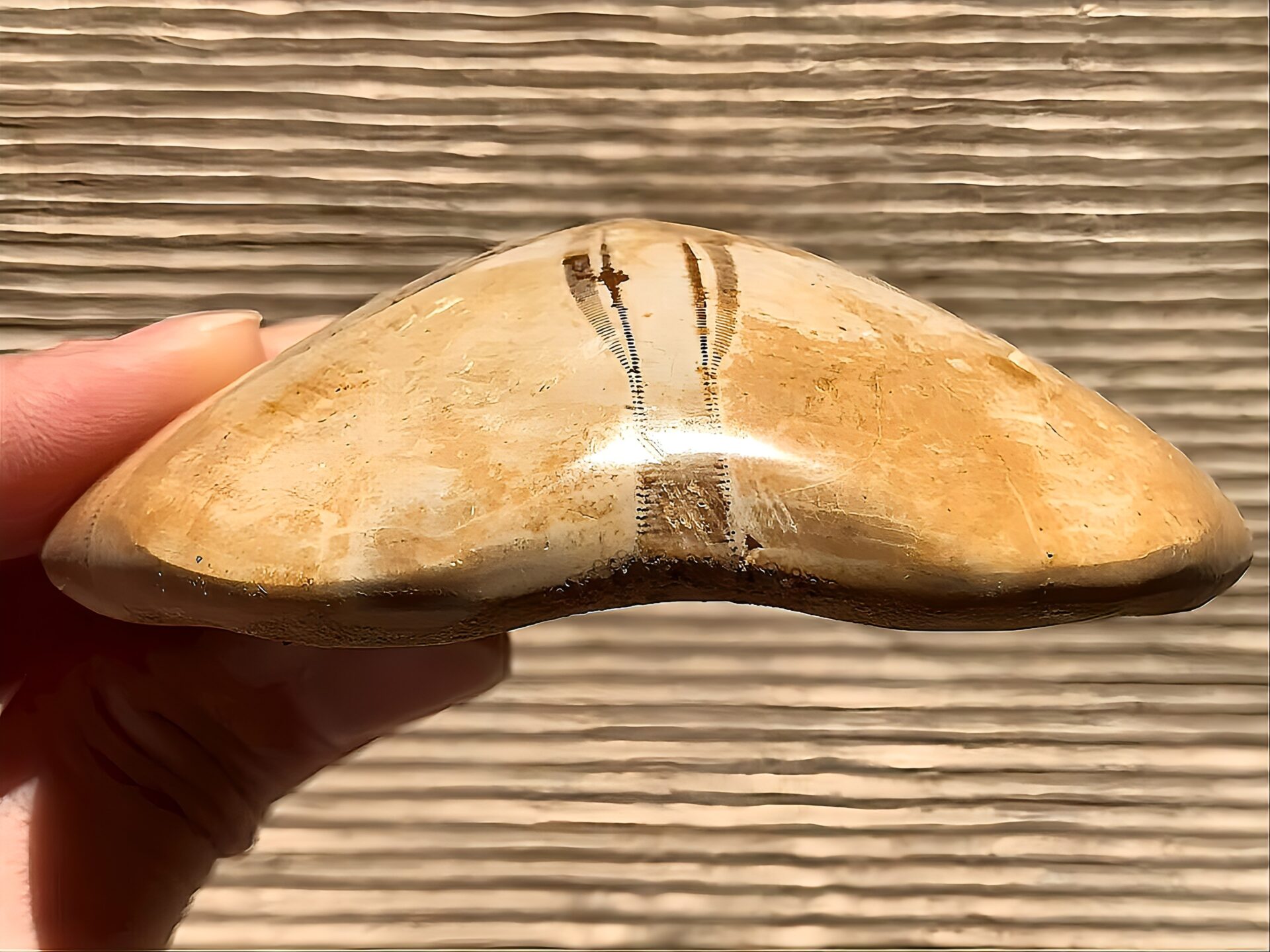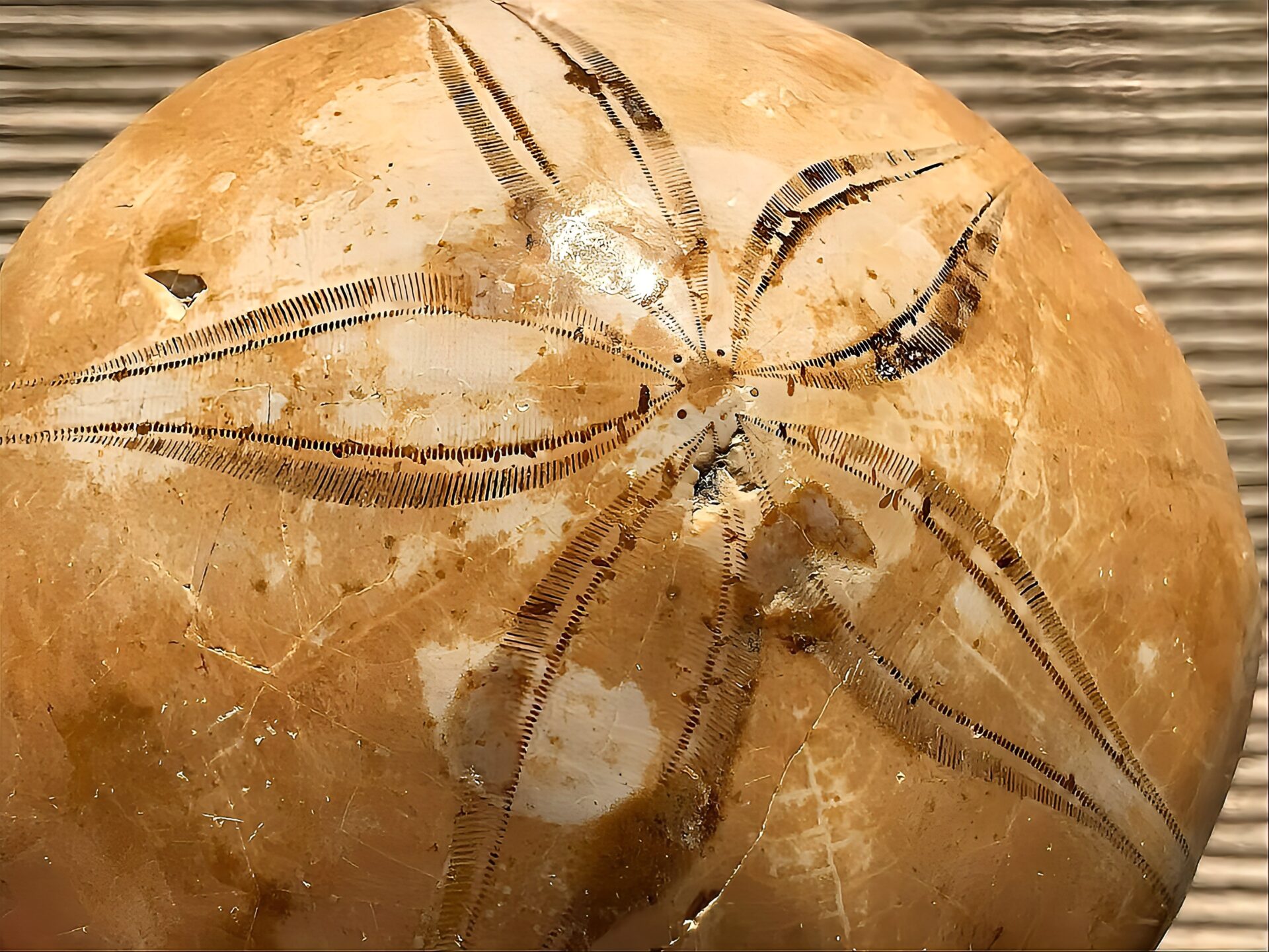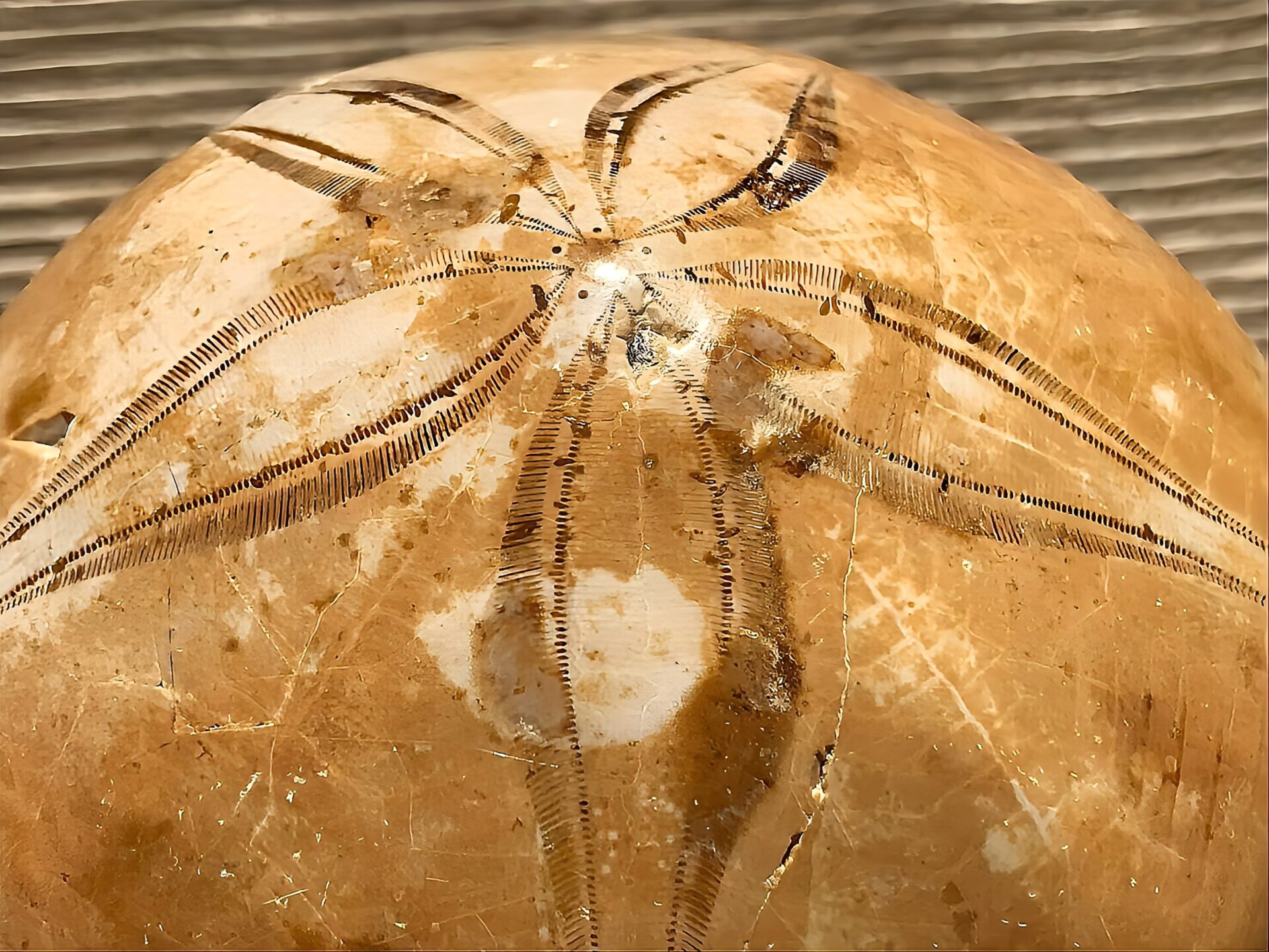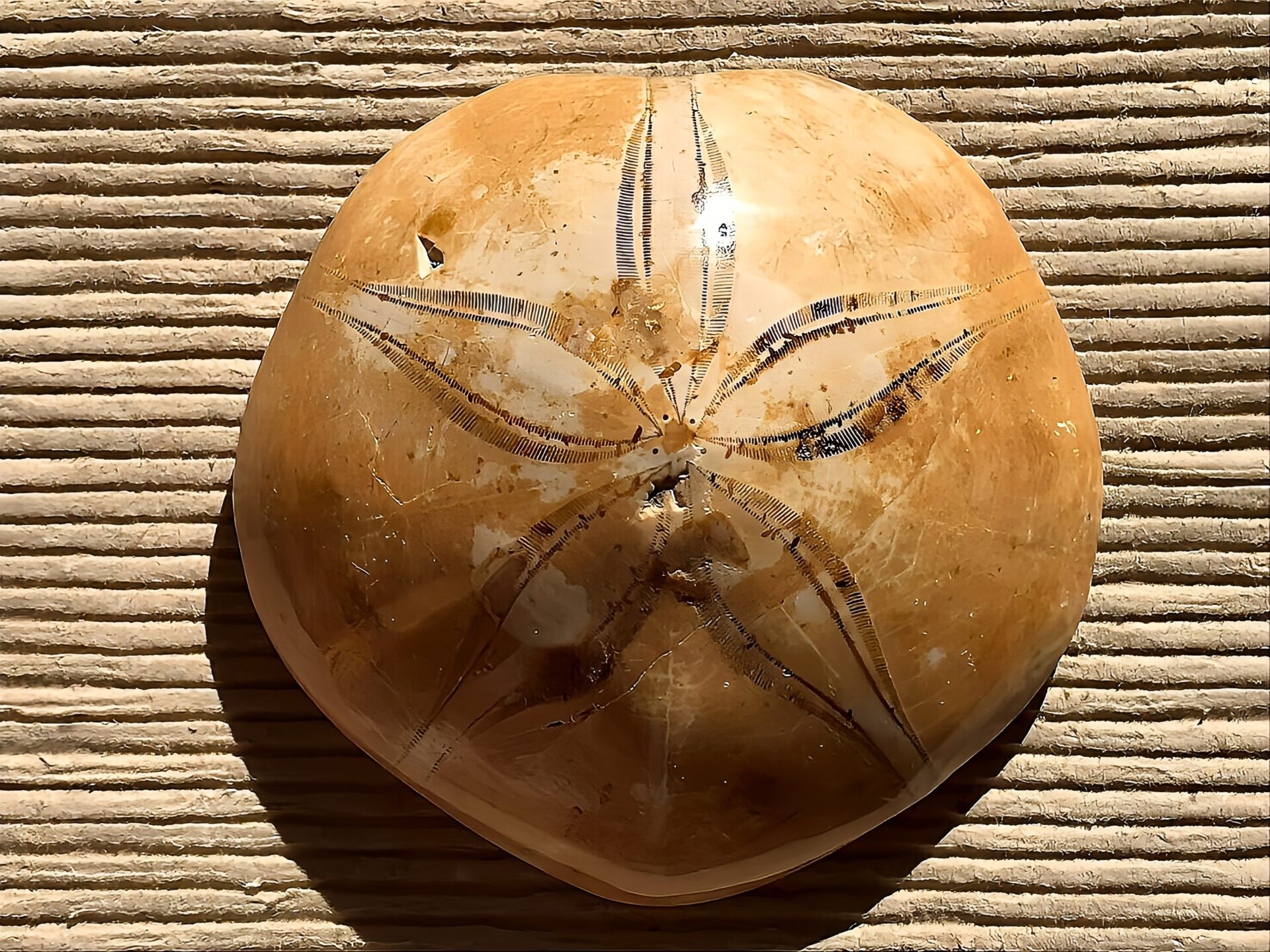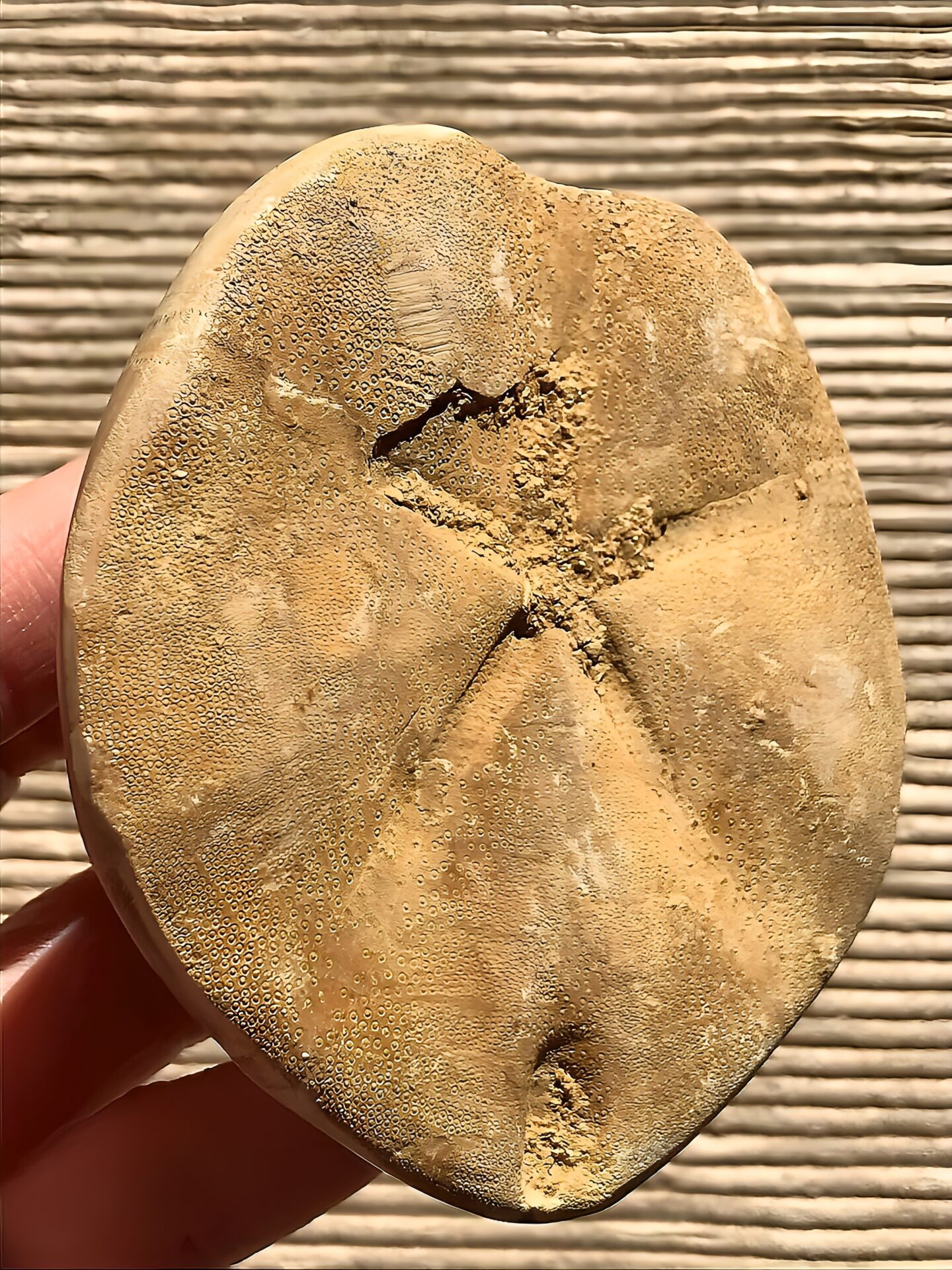 マダガスカル チュレア産 ウニの化石 タコノマクラ 中生代ジュラ紀 重さ 約52g 寸法 約7.7cm(最長部) ⭐︎中心部が膨らんでいて、花びらのような五芒星の模様が特徴なウニの化石です。 コレクションやプレゼントにいかがでしょうか。状態は写真にてご確認ください。 ※表面は研磨によりツルツルですが、裏面は未研磨でザラザラとしています。 ⭐︎日中の太陽光にて撮影をしておりますが、画像には映らない多少のキズ、欠け等がある可能性、 またカメラの性能や光の具合によって現物との色の違いがある場合がございます。