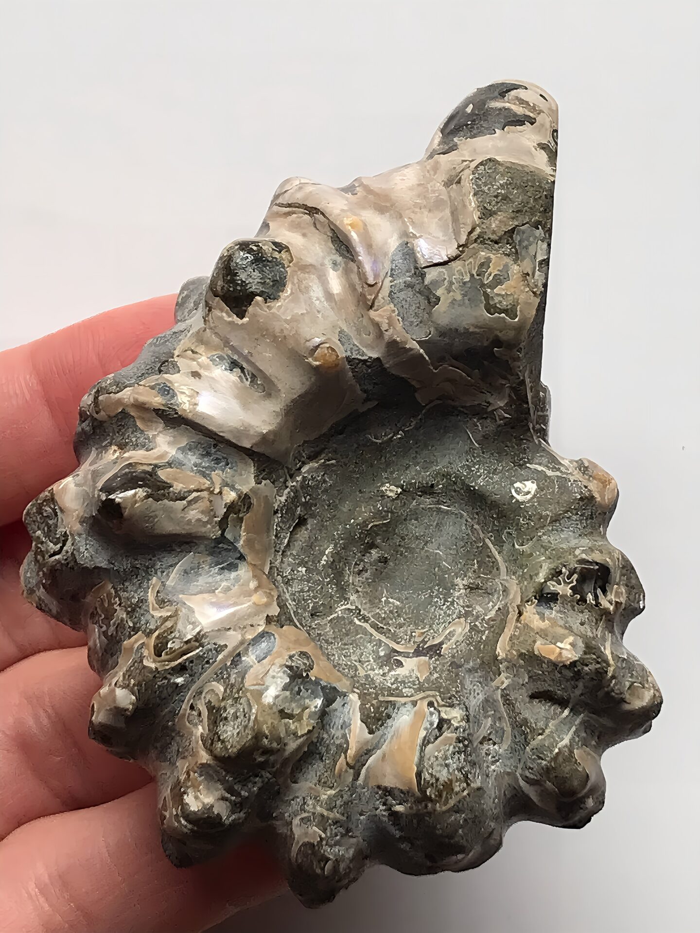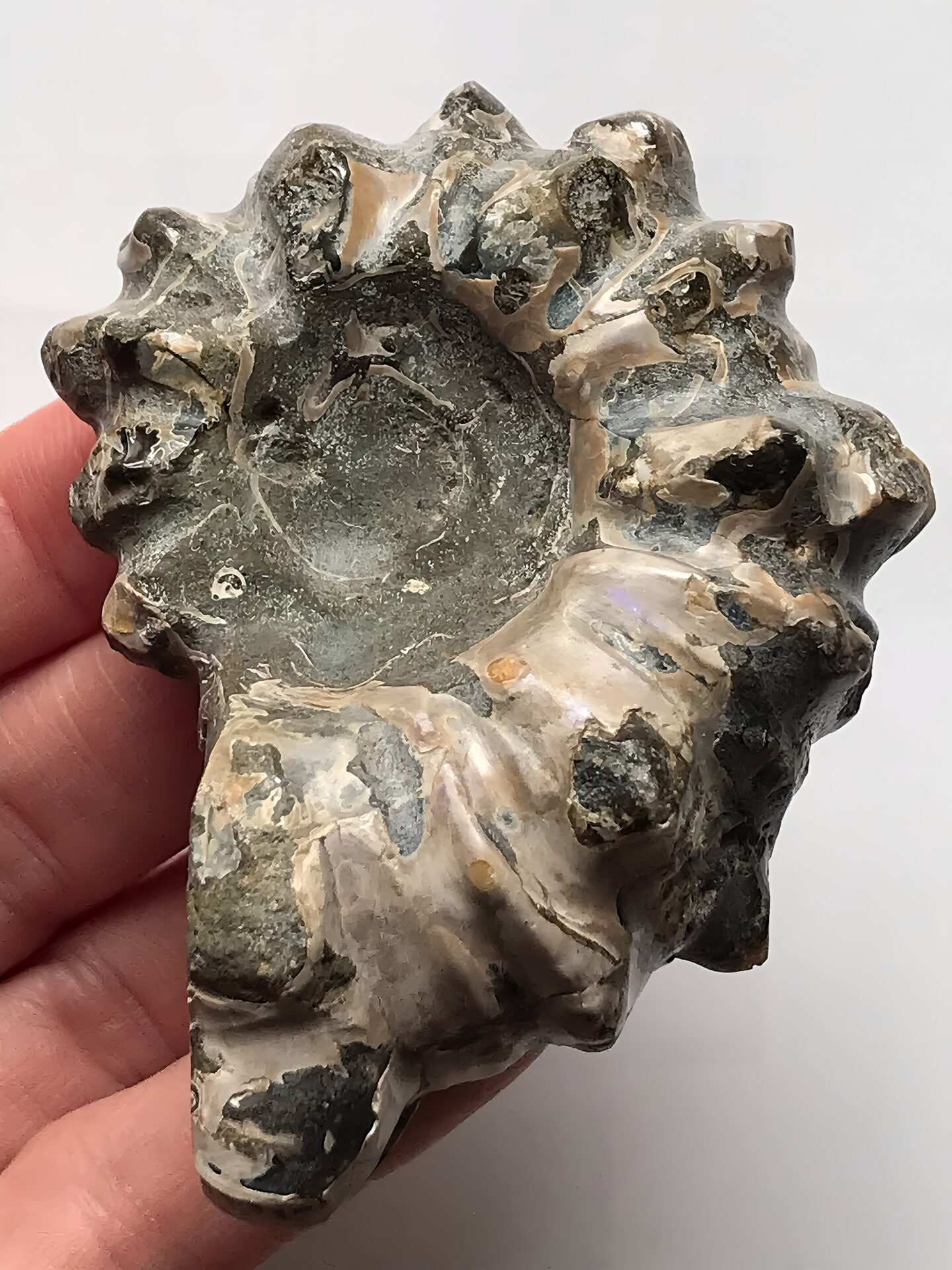 虹色の遊色効果があるアンモナイトです。殻表面が日光や照明にあたる角度によって青、緑、紫、ピンク等に輝き飽きがきません。カラフルな色彩の個体をお探しの方や、プレゼントとしての化石をお考えの方はこの機会にいかがでしょうか。