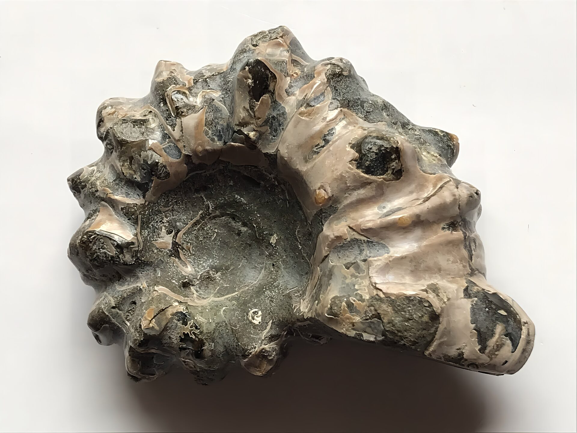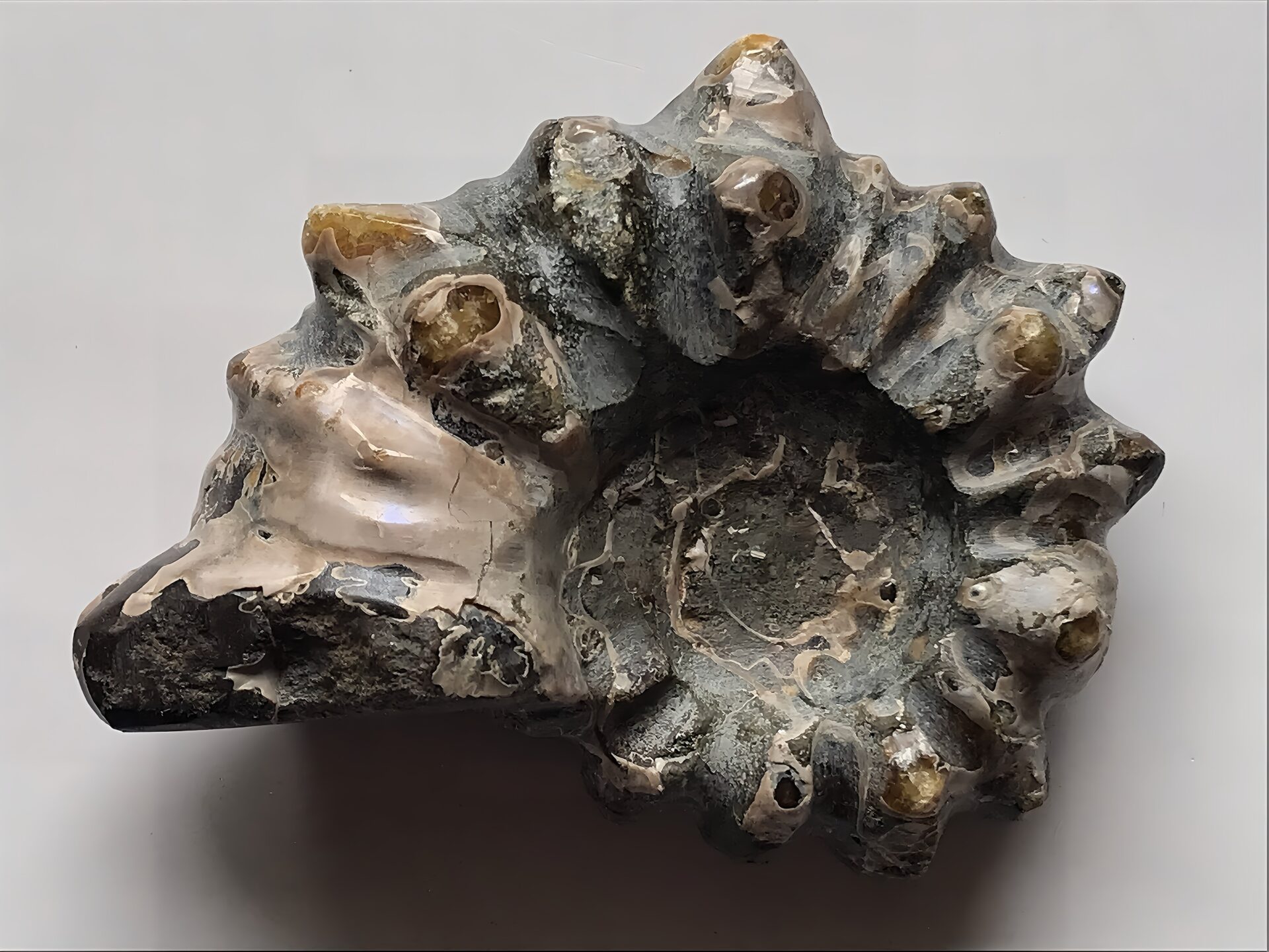 ■アンモナイトは、古生代シルル紀末期から中生代白亜紀末までの約3億5000万年前後の間を、海洋に広く分布し繁栄していた頭足類の分類群の一つです。 全ての種が平らな巻き貝の形をした殻を持っているのが特徴です。