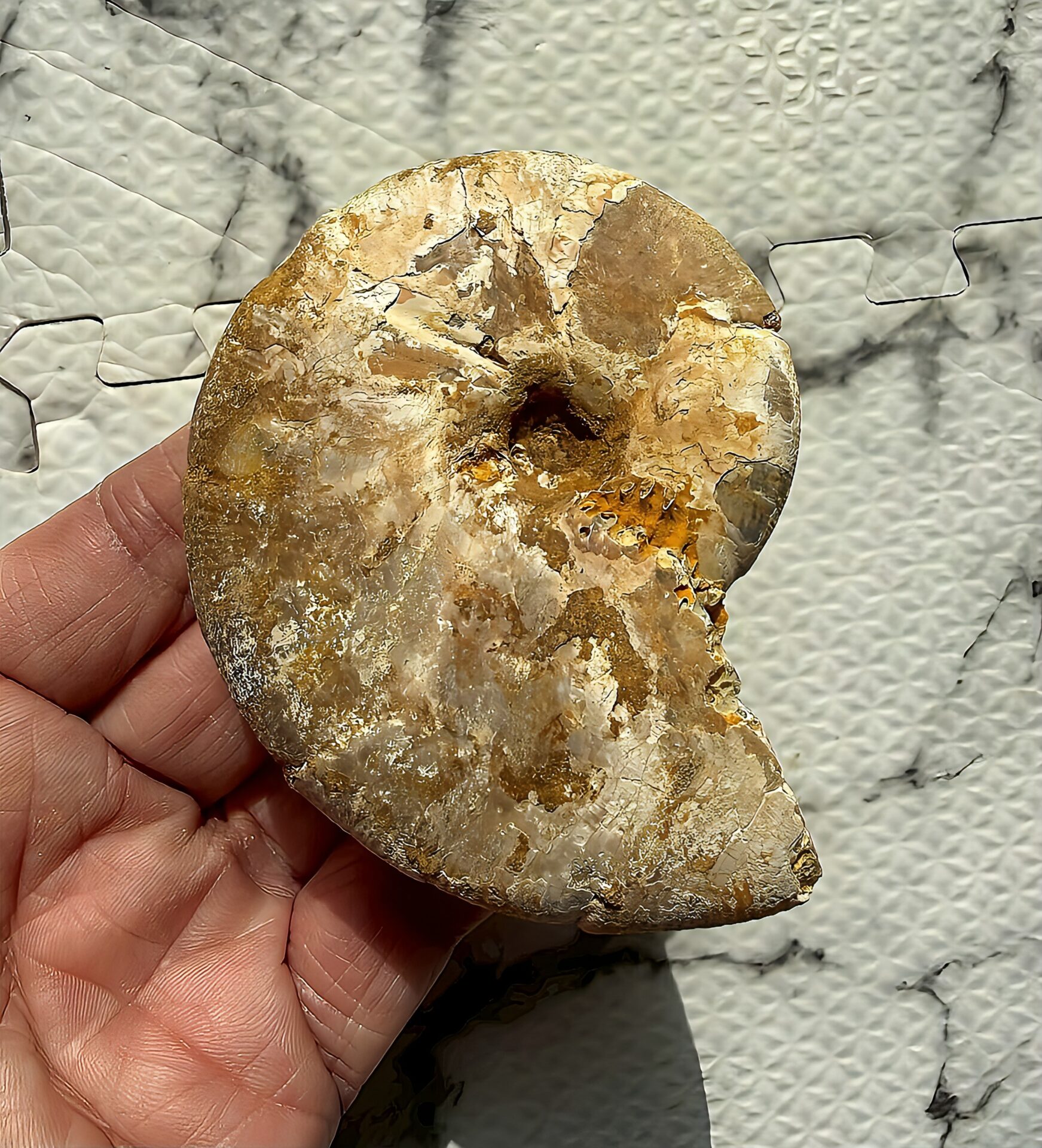 白褐色で自然な趣があるアンモナイトです。