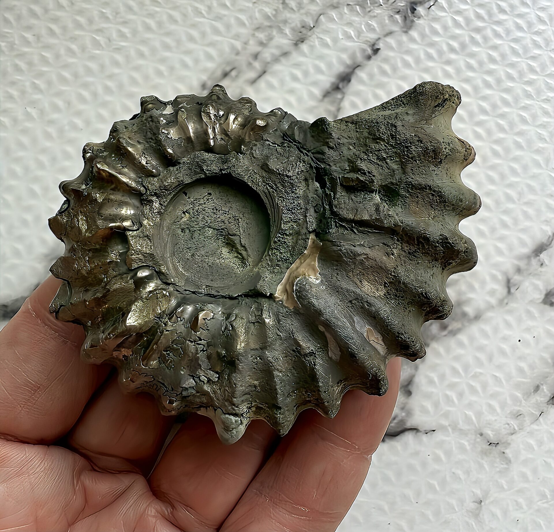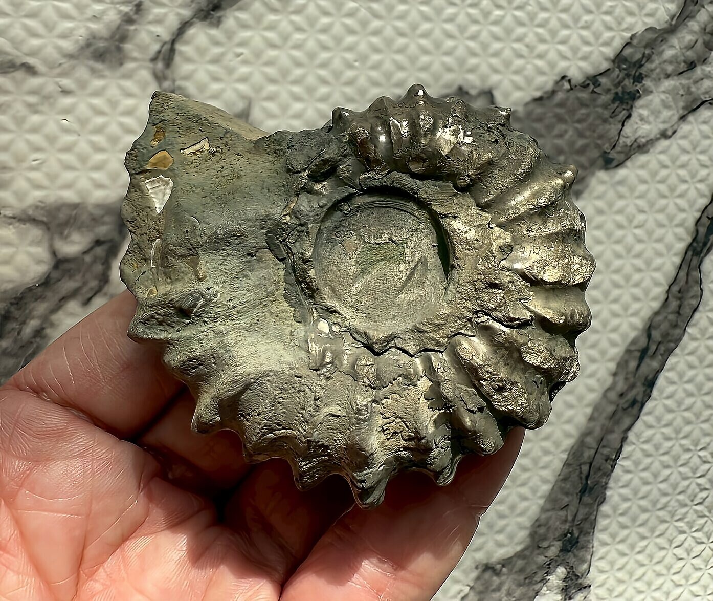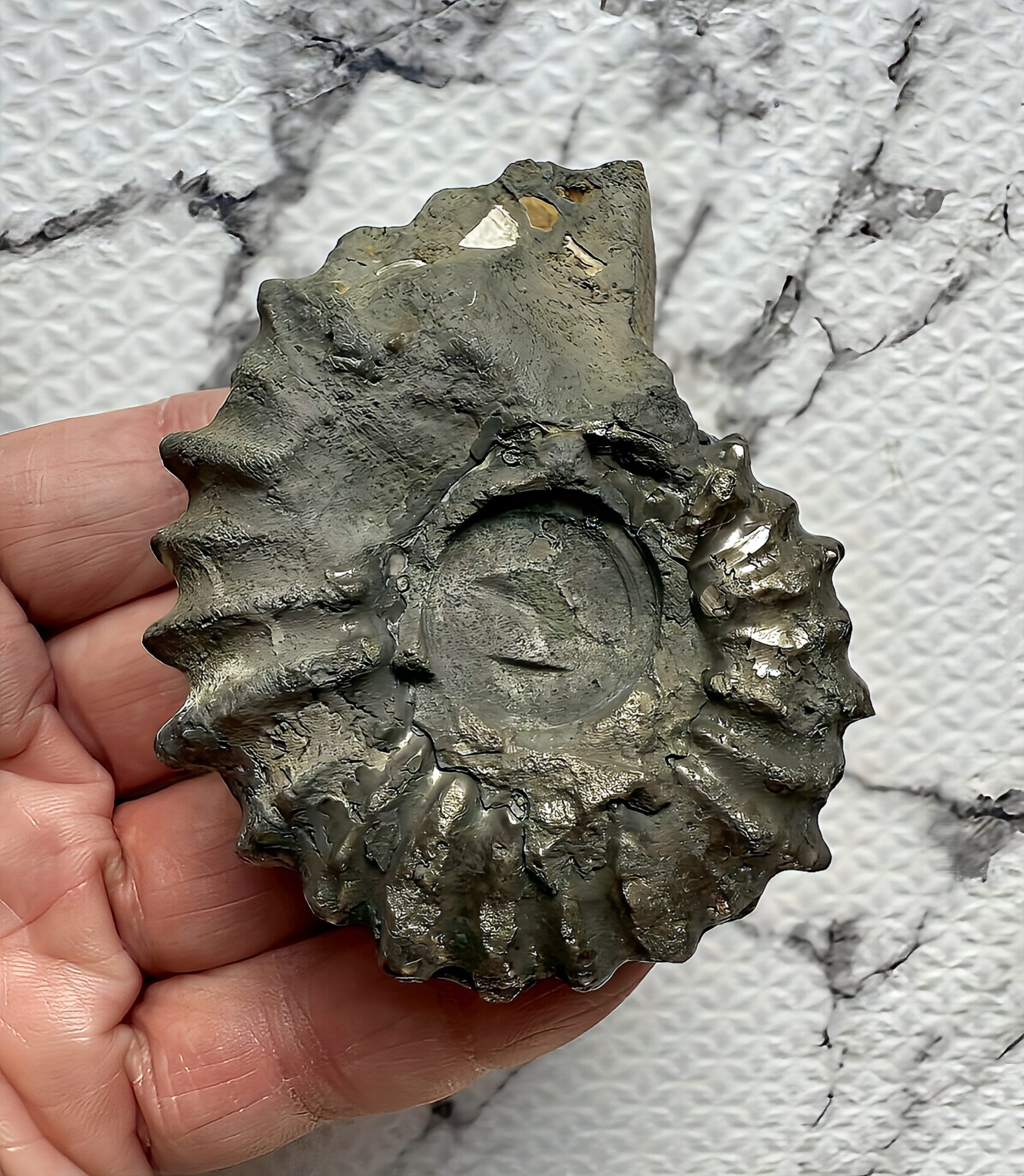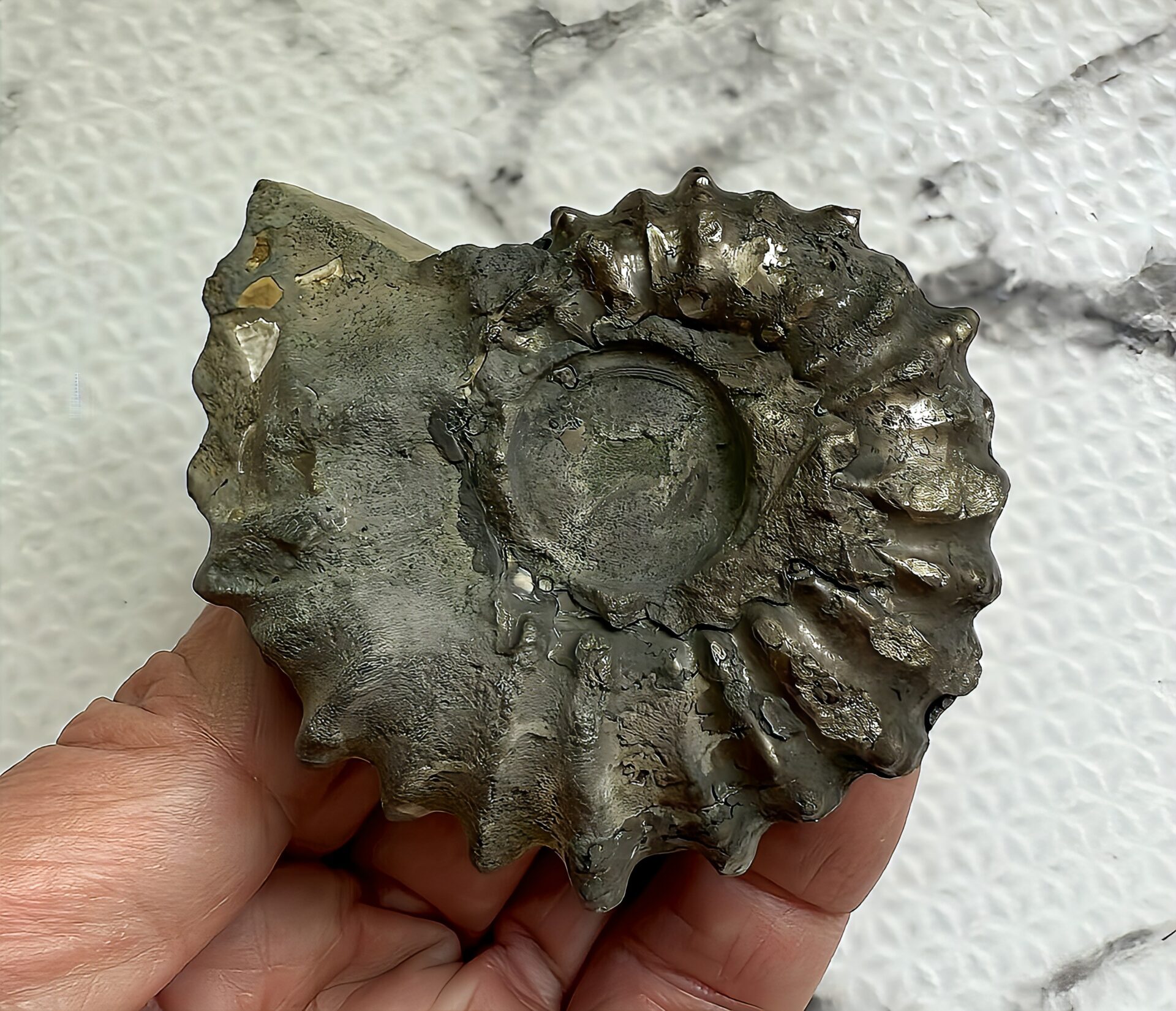 黄鉄鉱の金の光沢があるアンモナイトです。殻表面が日光や照明にあたる角度によって黄金色に輝き飽きがきません。金属光沢のある個体をお探しの方や、プレゼントとしての化石をお考えの方はこの機会にいかがでしょうか。