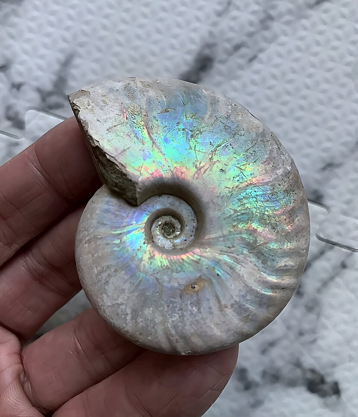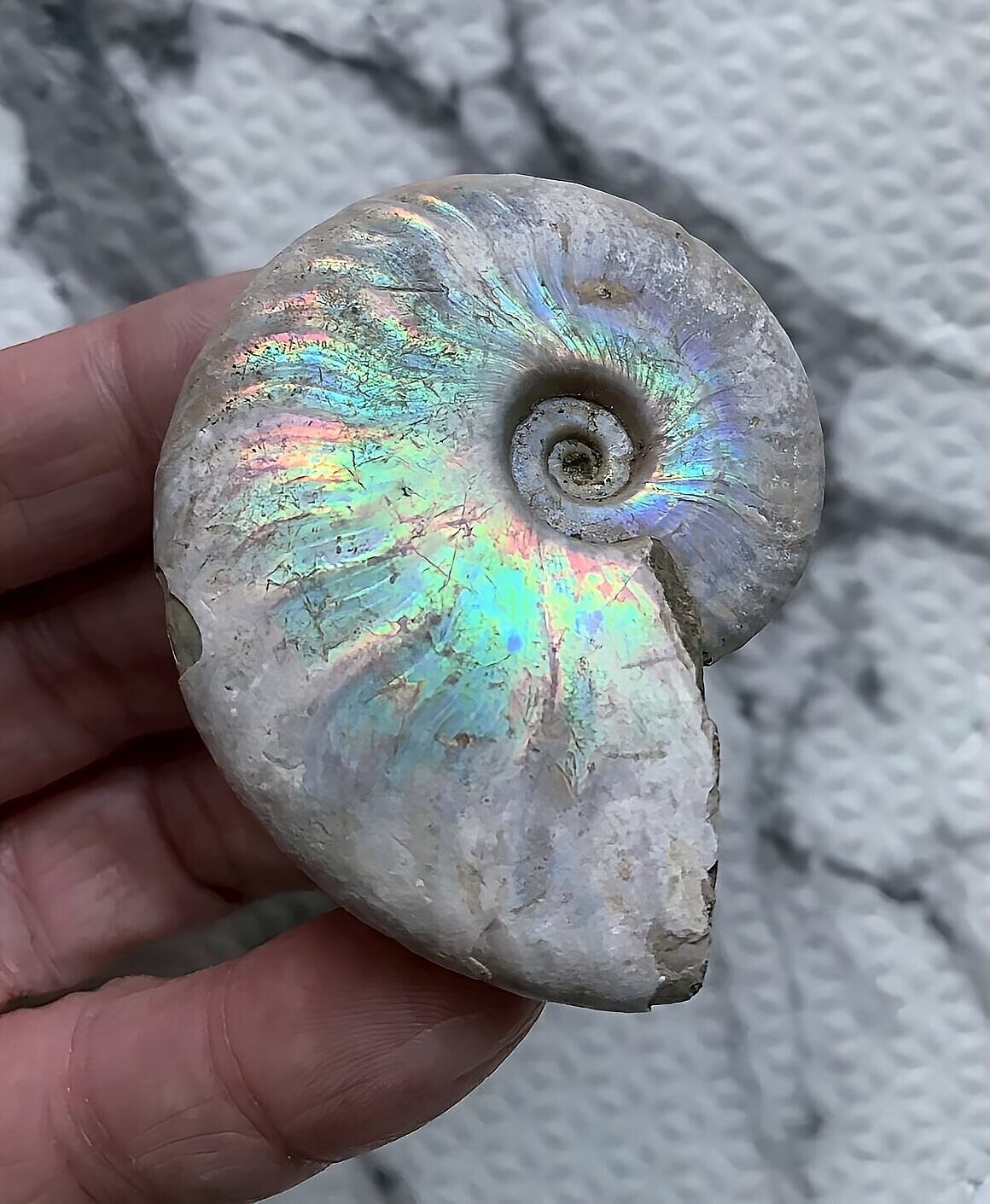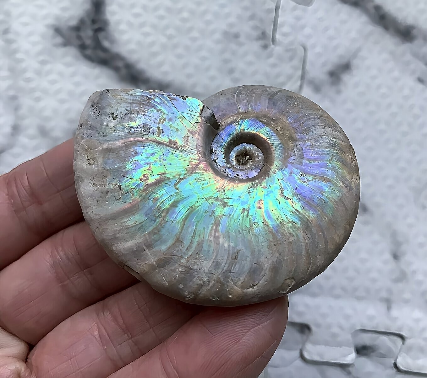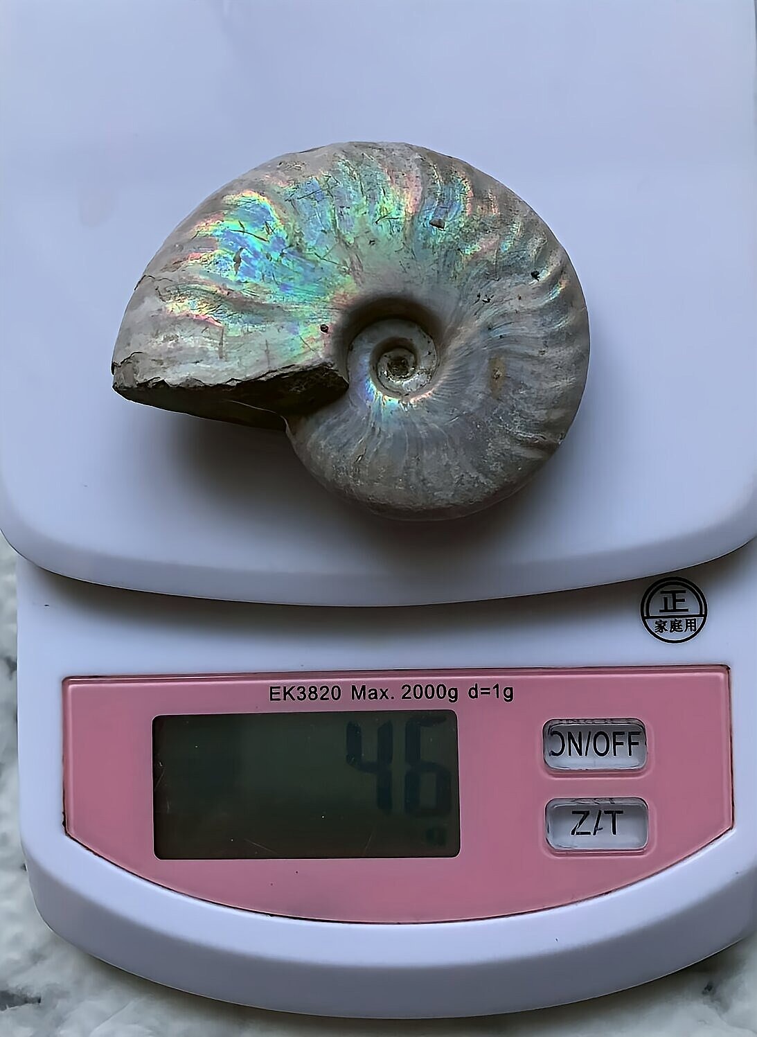 虹色の遊色効果があるアンモナイトです。殻表面が日光や照明にあたる角度によって青、緑、紫、ピンク等に輝き飽きがきません。