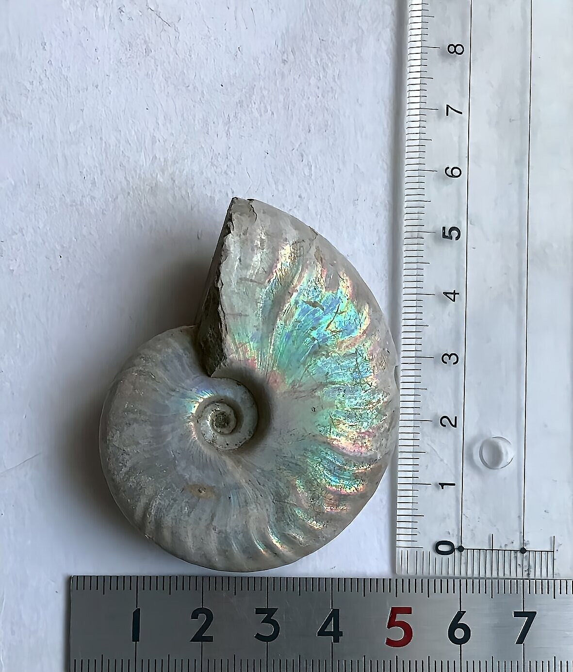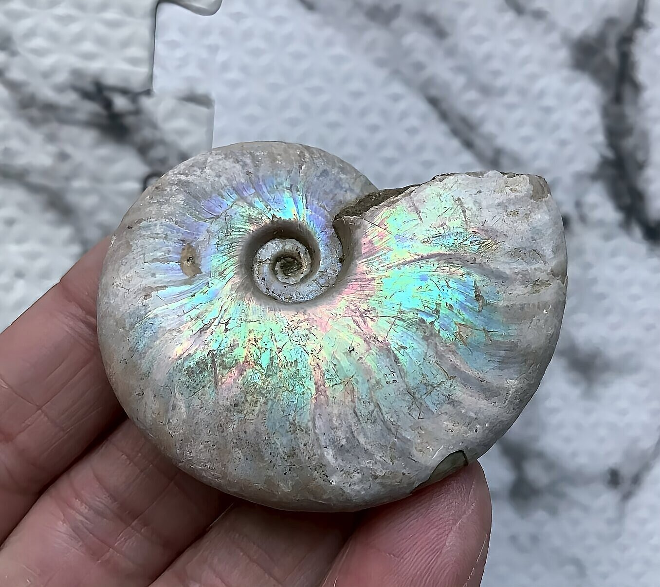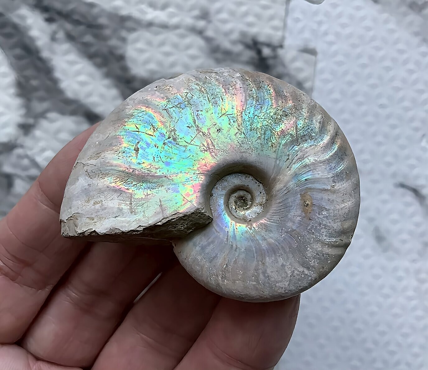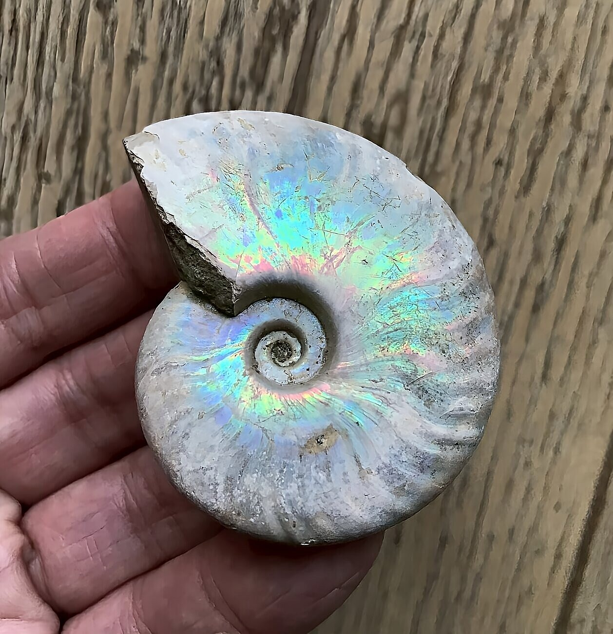虹色の遊色効果があるアンモナイトです。殻表面が日光や照明にあたる角度によって青、緑、紫、ピンク等に輝き飽きがきません。
