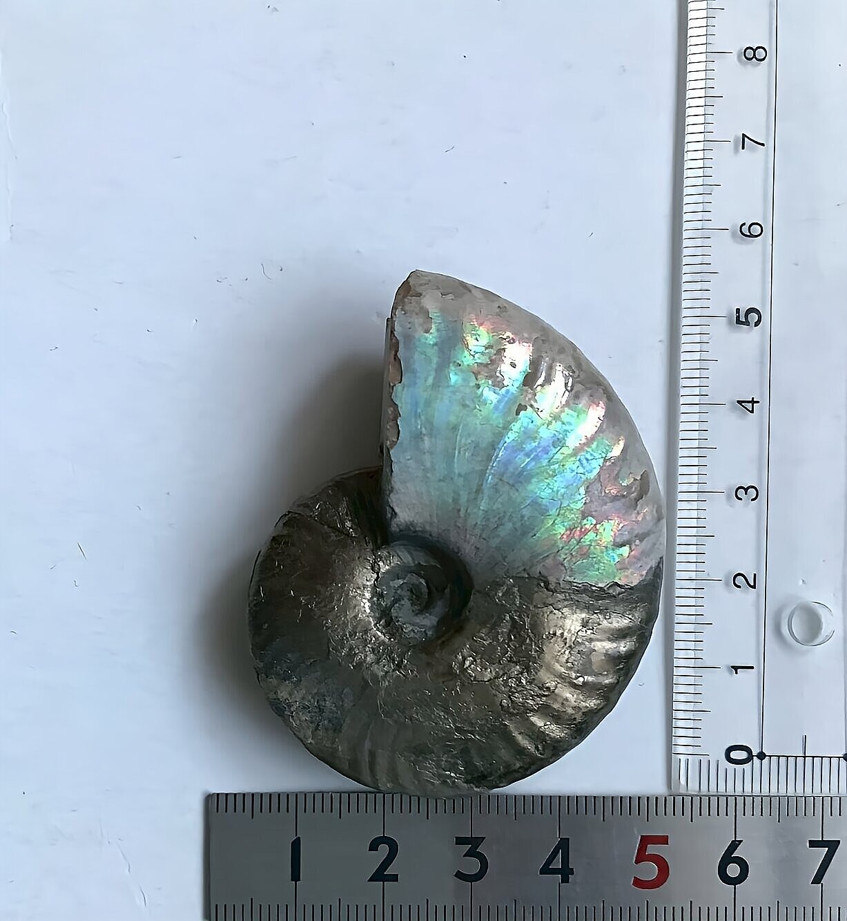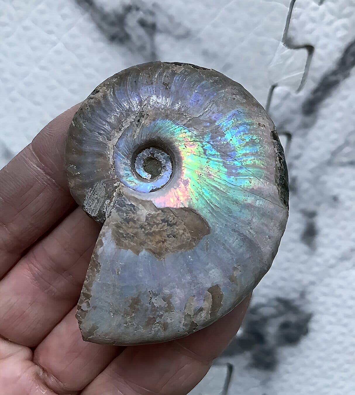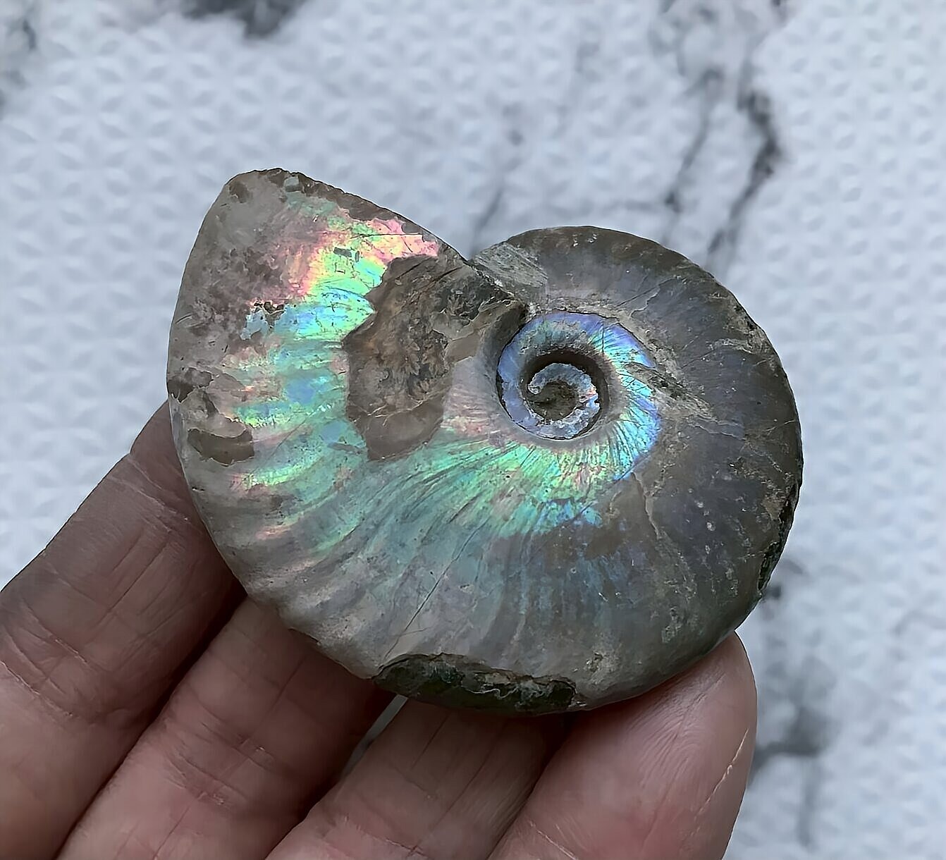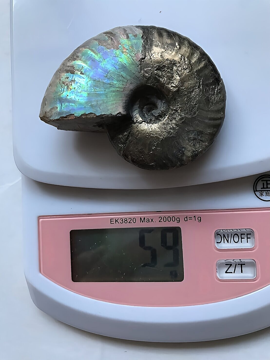 虹色の遊色効果があるアンモナイトです。殻表面が日光や照明にあたる角度によって青、緑、紫、ピンク等に輝き飽きがきません。
