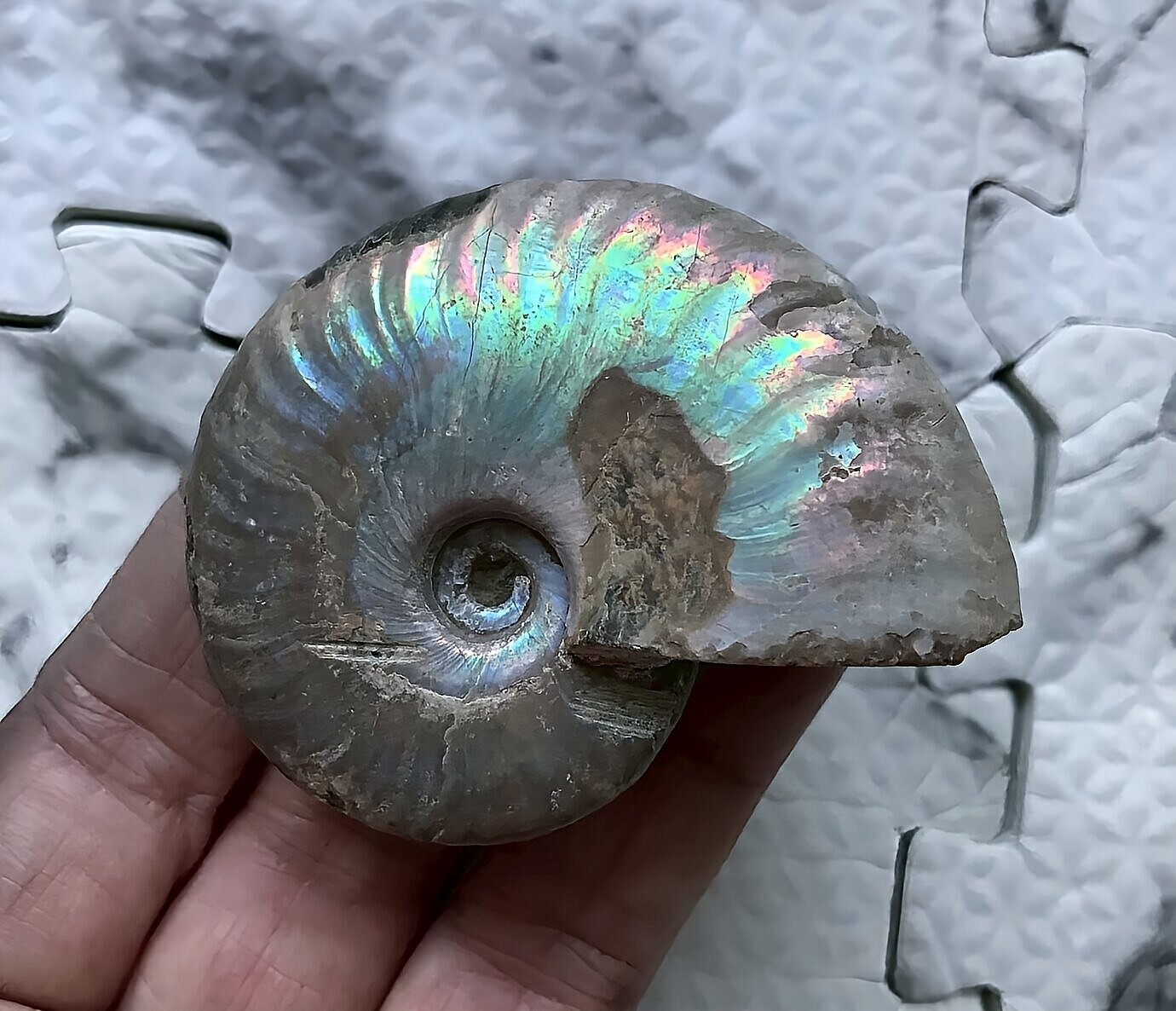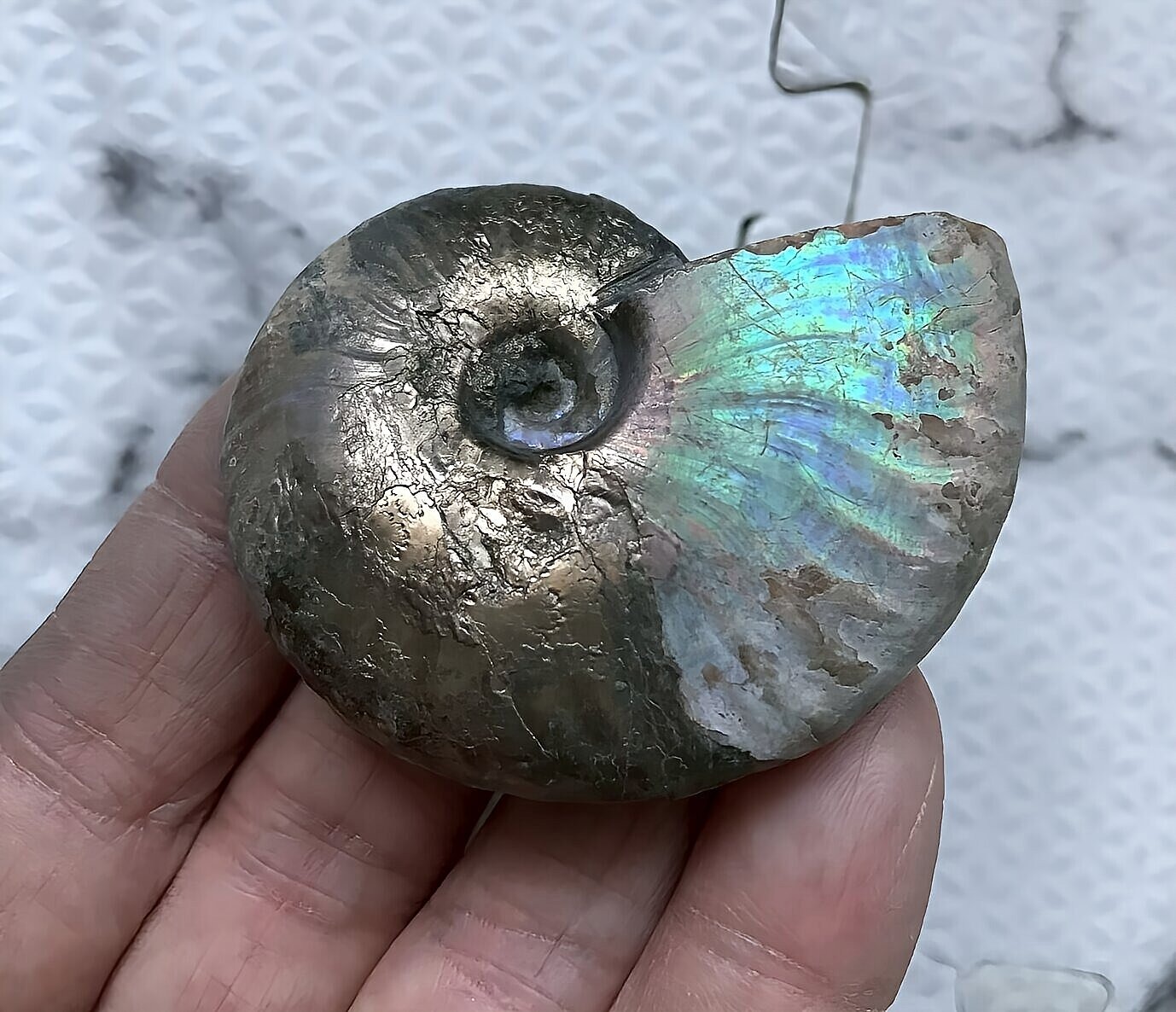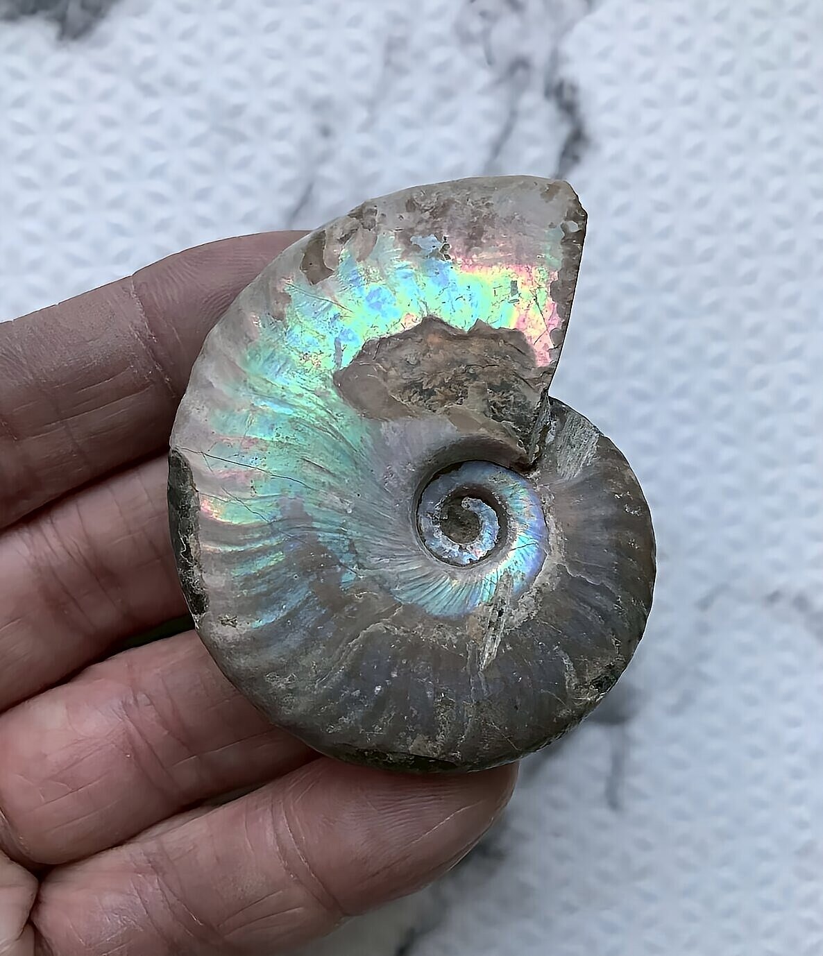 虹色の遊色効果があるアンモナイトです。殻表面が日光や照明にあたる角度によって青、緑、紫、ピンク等に輝き飽きがきません。