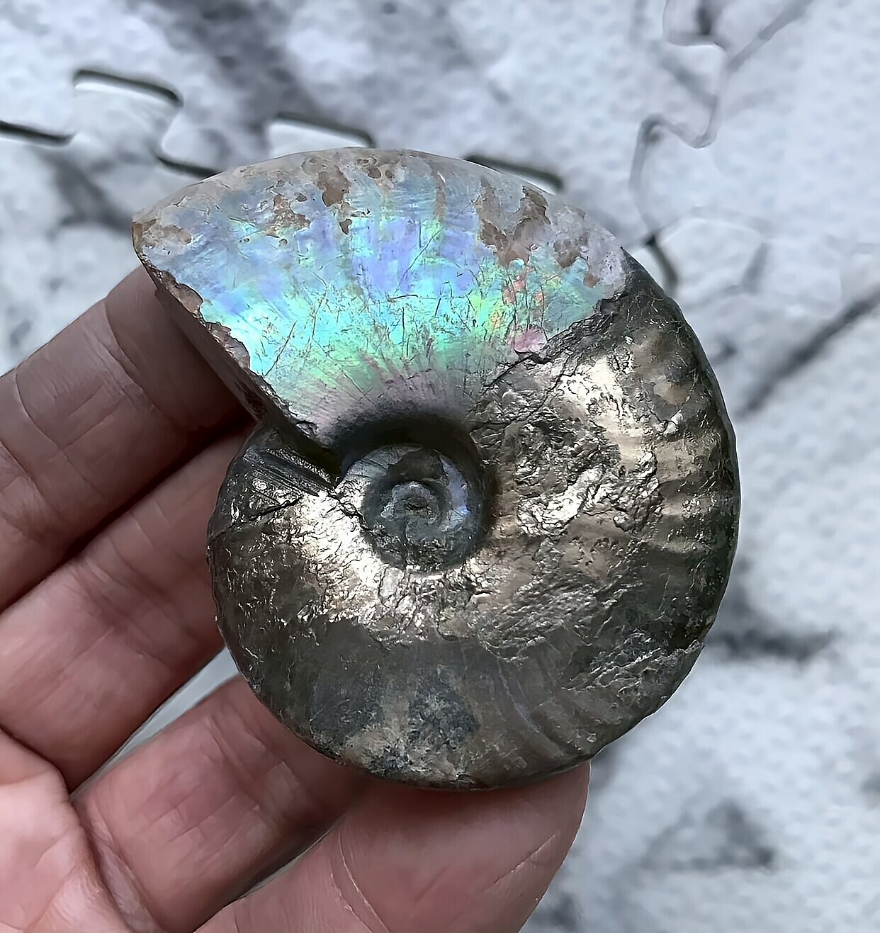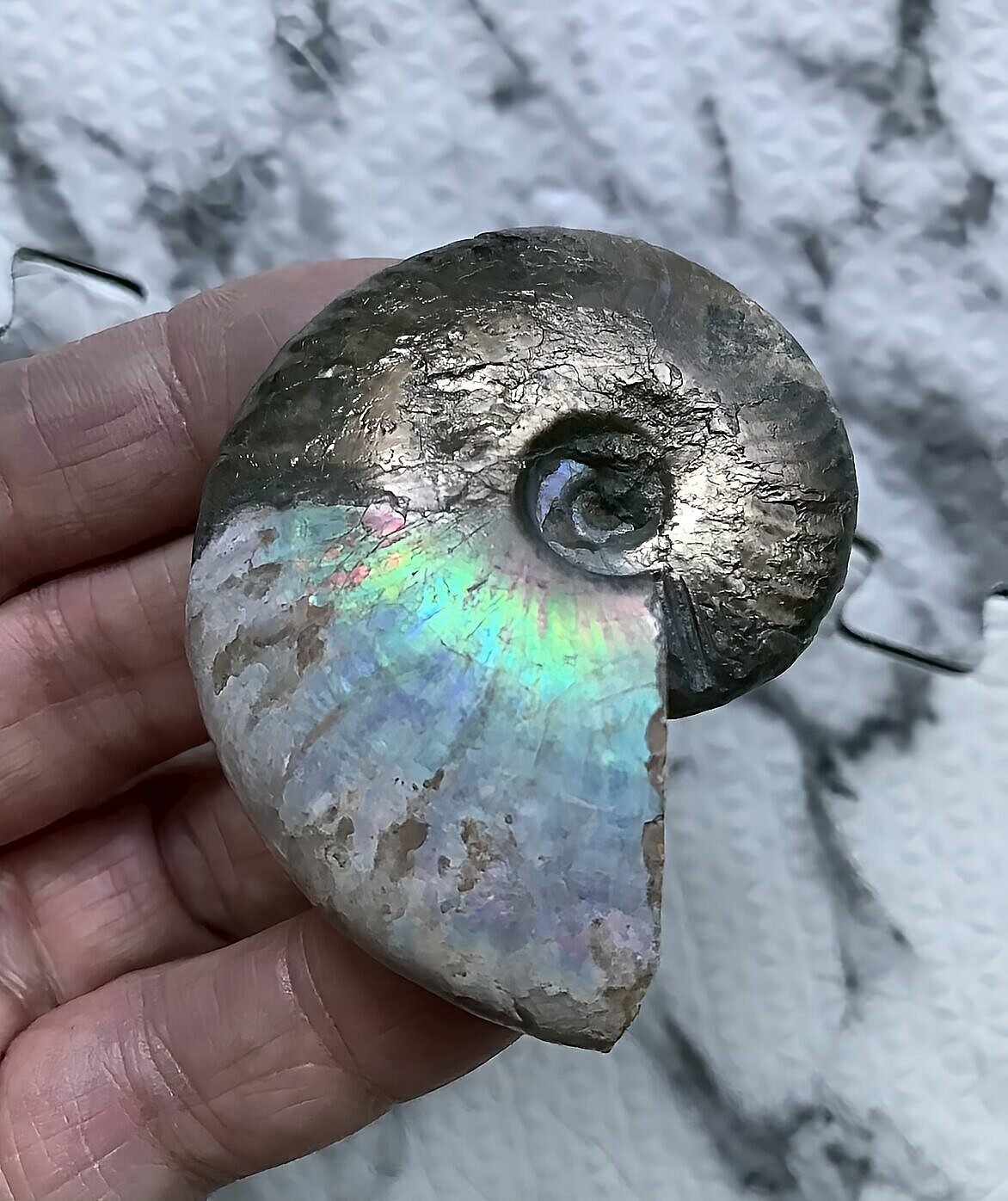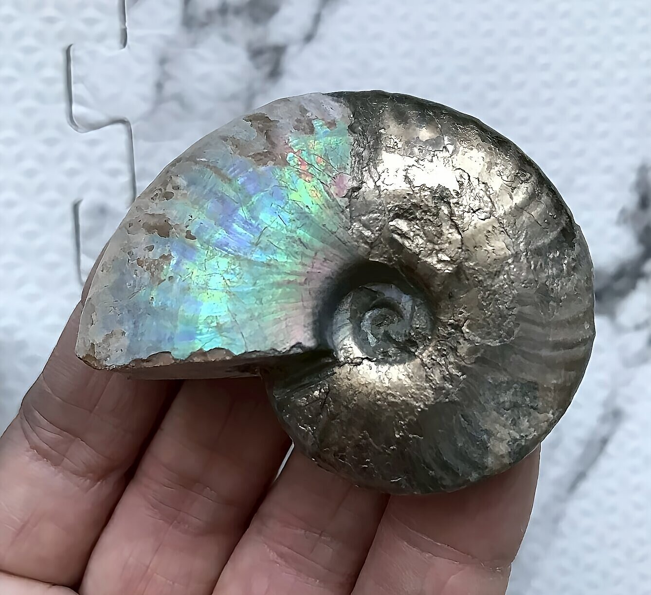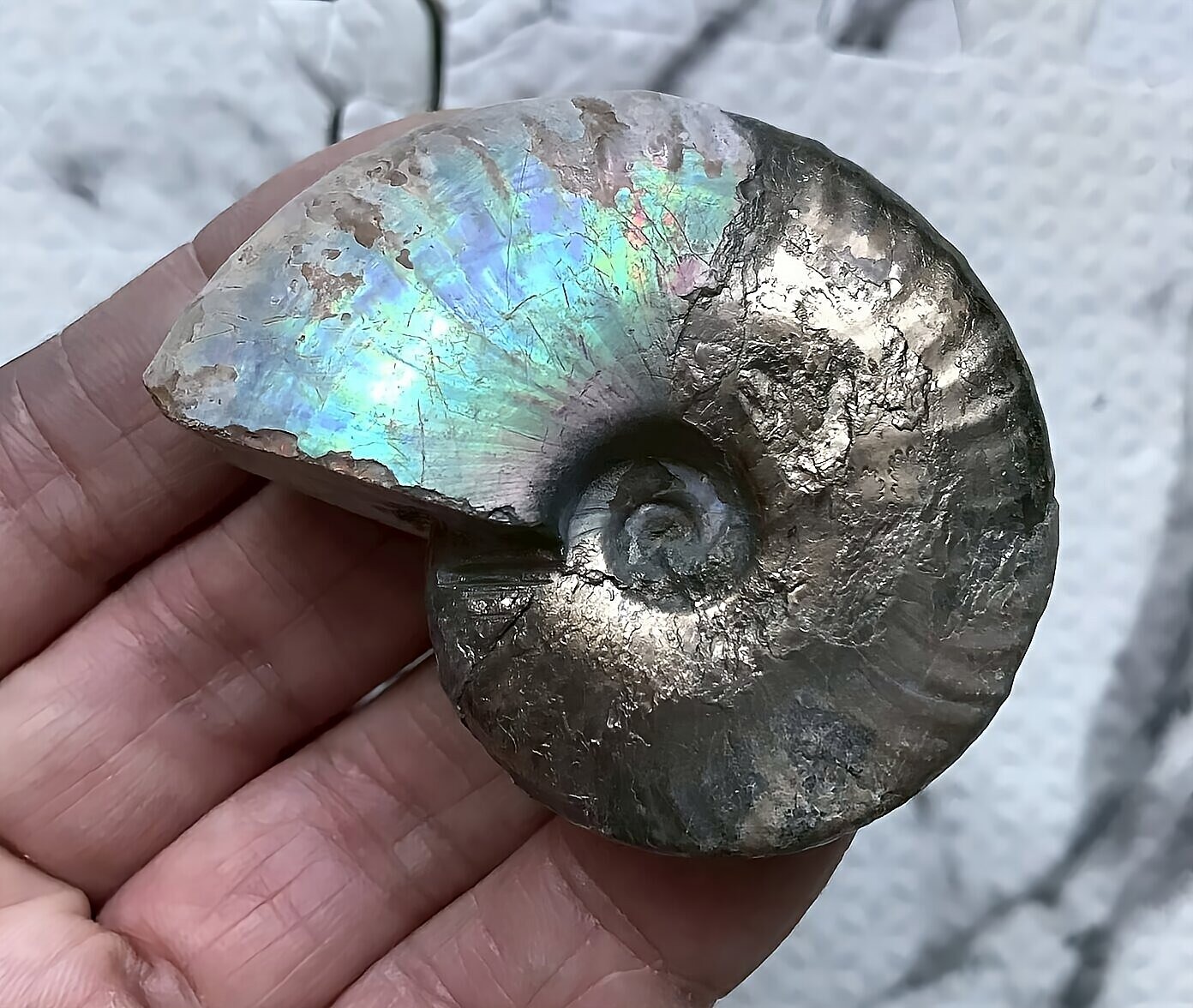 虹色の遊色効果があるアンモナイトです。殻表面が日光や照明にあたる角度によって青、緑、紫、ピンク等に輝き飽きがきません。
